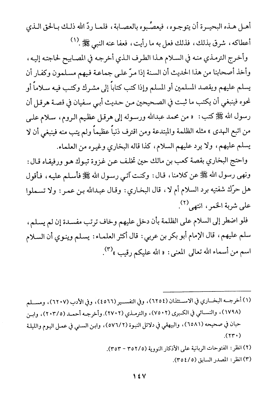 وأخرج الترمذي منه في السلام هذا الطرف الذي أخرجه في المصابيح لحاجته إليه، وأخذ أصحابنا من هذا الحديث أن السنة إذا مرّ على جماعة فيهم مسلمون وكفار أن يسلم عليهم ويقصد المسلمين أو المسلم وإذا كتب كتابًا إلي مشرك وكتب فيه سلامًا أو نحوه فينبغي أن يكتب ما ثبت في الصحيحين من حديث أبي سفيان في قصة هرقل أن رسول الله -صلى الله عليه وسلم- كتب: "من محمَّد عبد الله ورسوله إلى هرقل عظيم الروم، سلام على من اتبع الهدى" مثله الظلمة والمبتدعة ومن اقترف ذنبًا عظيمًا ولم يتب منه فينبغي أن لا يسلم عليهم، ولا يرد عليهم السلام، كذا قاله البخاري وغيره من العلماء.