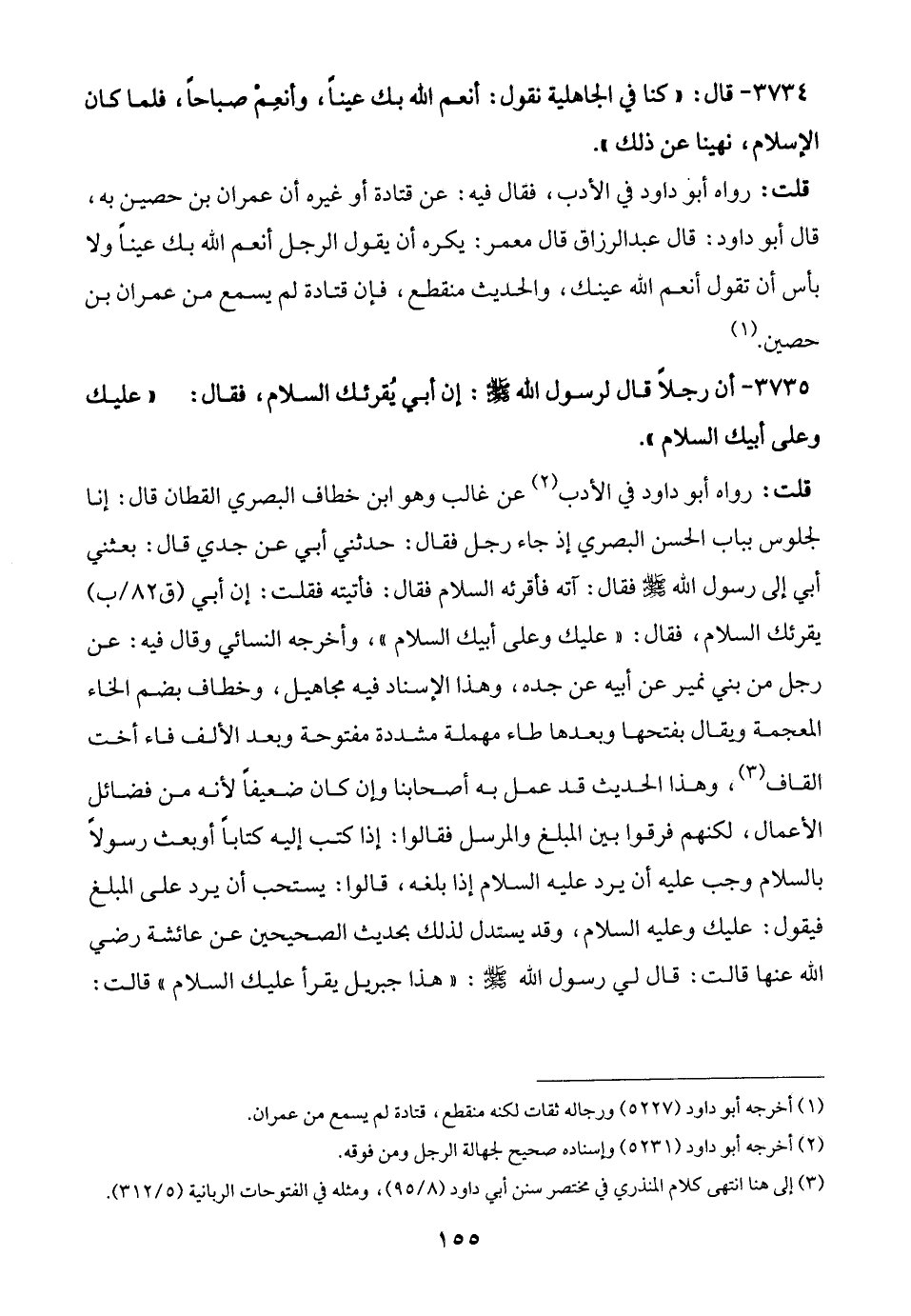 قلت: رواه أبو داود في الأدب، فقال فيه: عن قتادة أو غيره أن عمران بن حصين به، قال أبو داود: قال عبد الرزاق قال معمر: يكره أن يقول الرجل أنعم الله بك عينًا ولا بأس أن تقول أنعم الله عينك، والحديث منقطع، فإن قتادة لم يسمع من عمران بن حصين. (¬1)