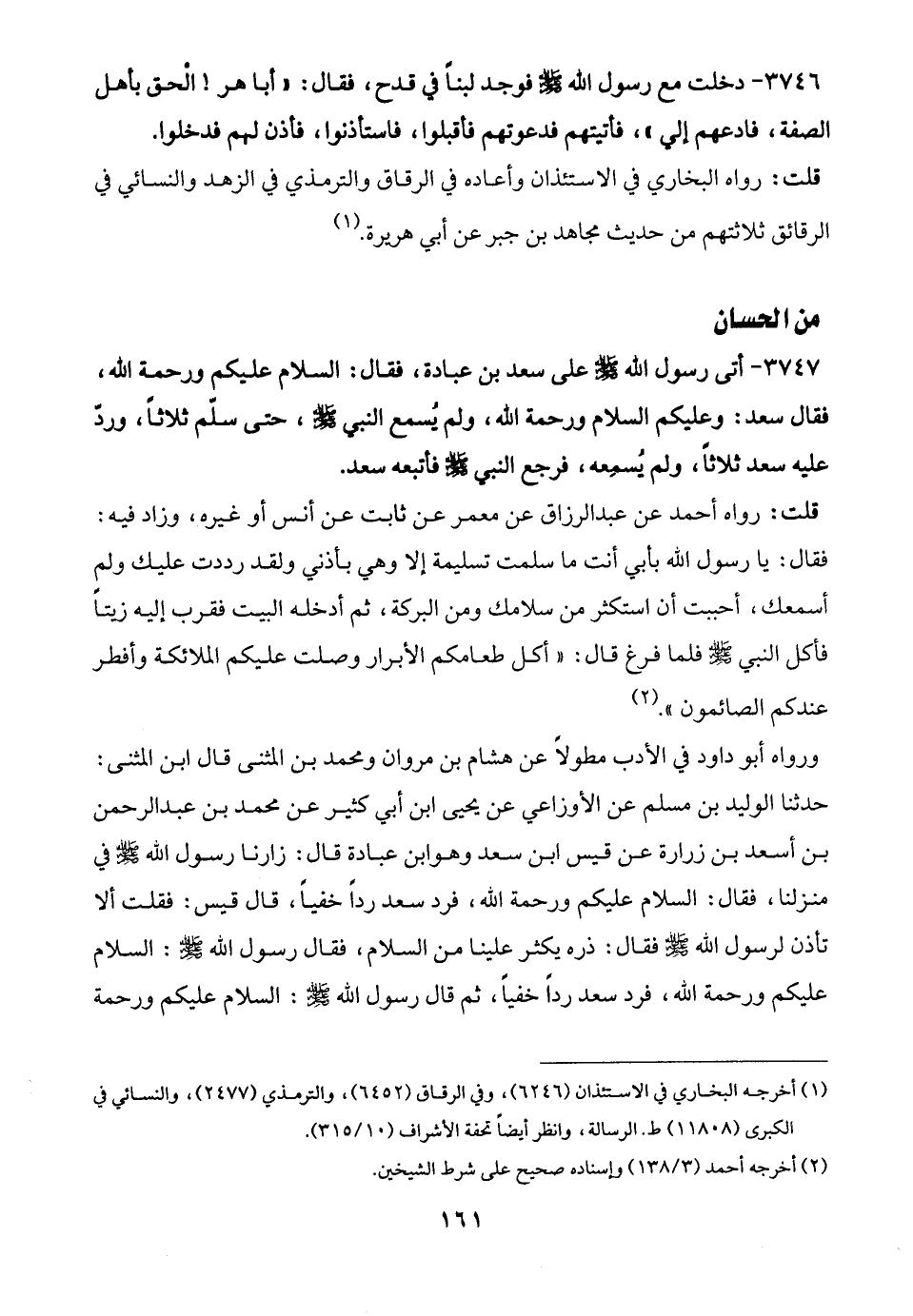 3747 - أتى رسول الله -صلى الله عليه وسلم- على سعد بن عبادة، فقال: السلام عليكم ورحمة الله، فقال سعد: وعليكم السلام ورحمة الله، ولم يُسمع النبي -صلى الله عليه وسلم-، حتى سلّم ثلاثًا، وردّ عليه سعد ثلاثًا، ولم يُسمِعه، فرجع النبي -صلى الله عليه وسلم- فأتبعه سعد.