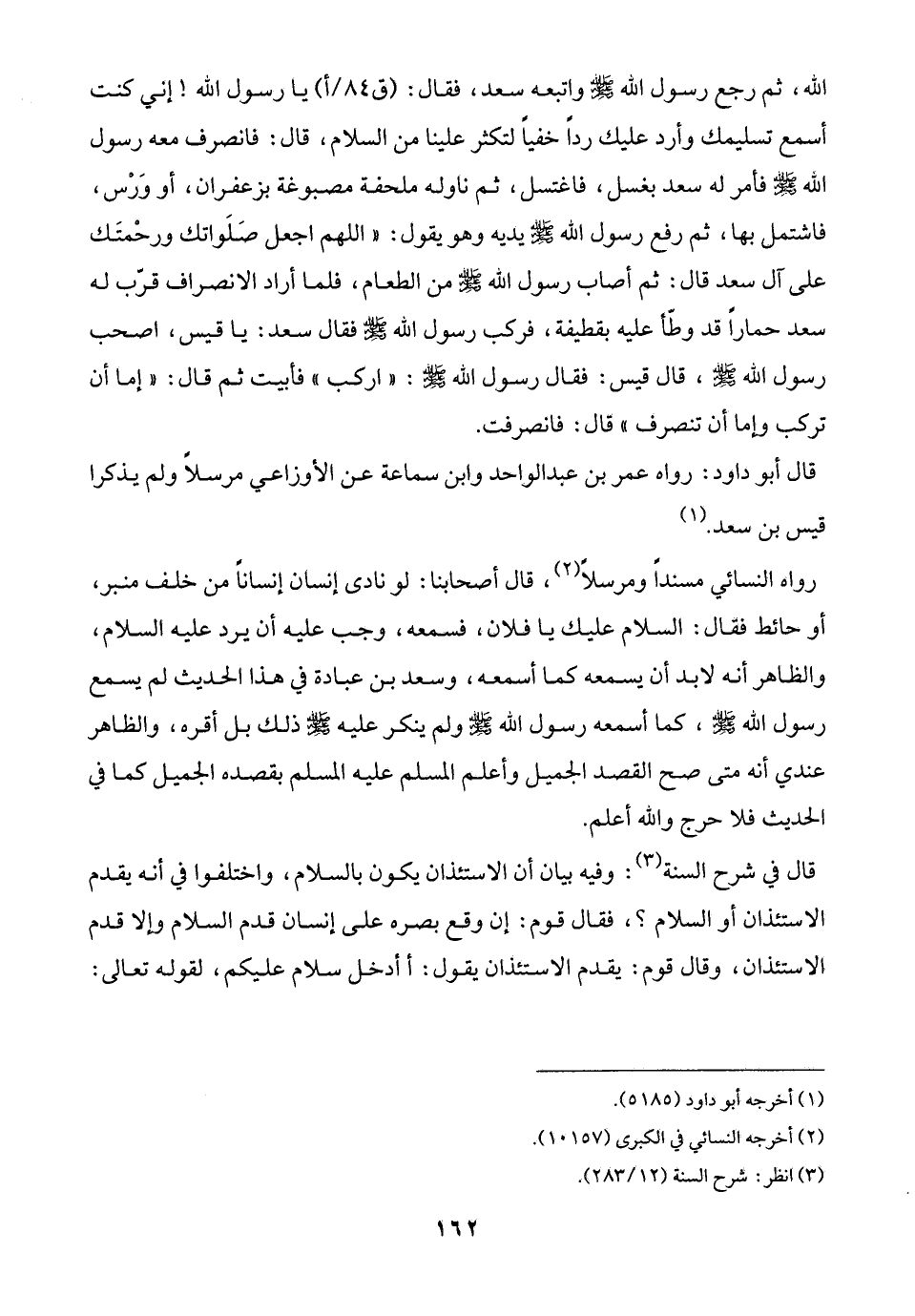 رواه النسائيُّ مسندًا ومرسلًا (¬2)، قال أصحابنا: لو نادى إنسان إنسانًا من خلف منبر، أو حائط فقال: السلام عليك يا فلان، فسمعه، وجب عليه أن يرد عليه السلام، والظاهر أنَّه لا بد أن يسمعه كما أسمعه، وسعد بن عبادة في هذا الحديث لم يسمع رسول الله -صلى الله عليه وسلم-، كما أسمعه رسول الله -صلى الله عليه وسلم- ولم ينكر عليه - صلى الله عليه وسلم - ذلك بل أقره، والظاهر عندي أنه متى صح القصد الجميل وأعلم المسلم عليه المسلم بقصده الجميل كما في الحديث فلا حرج والله أعلم.