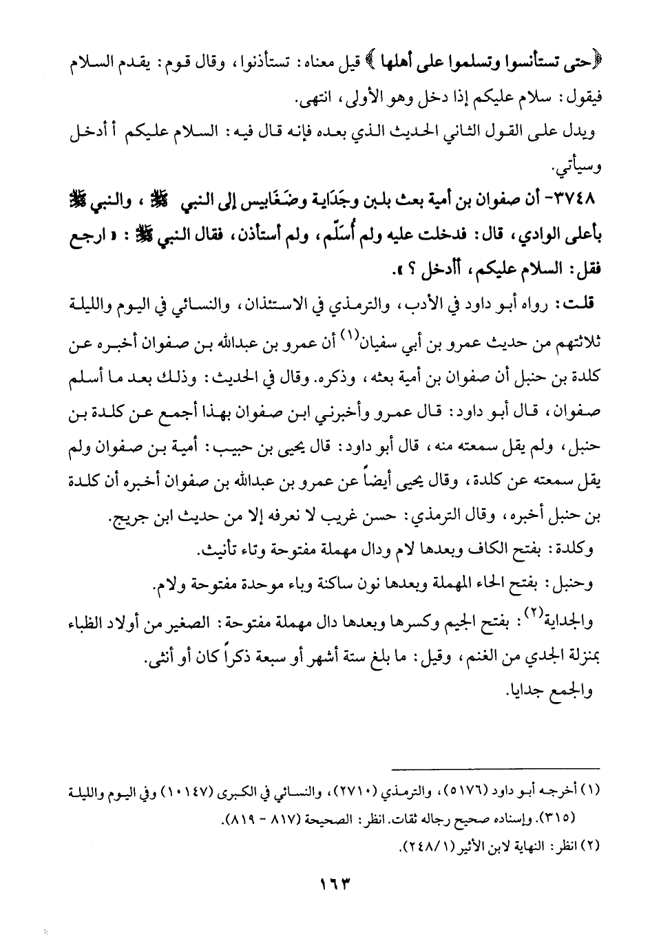 3748 - أن صفوان بن أمية بعث بلبن وجَداية وضَغابيس إلى النبي -صلى الله عليه وسلم-، والنبي - صلى الله عليه وسلم - بأعلى الوادي، قال: فدخلت عليه ولم أُسَلّم، ولم أستأذن، فقال النبي -صلى الله عليه وسلم-: "ارجع فقل: السلام عليكم، أأدخل؟ ".