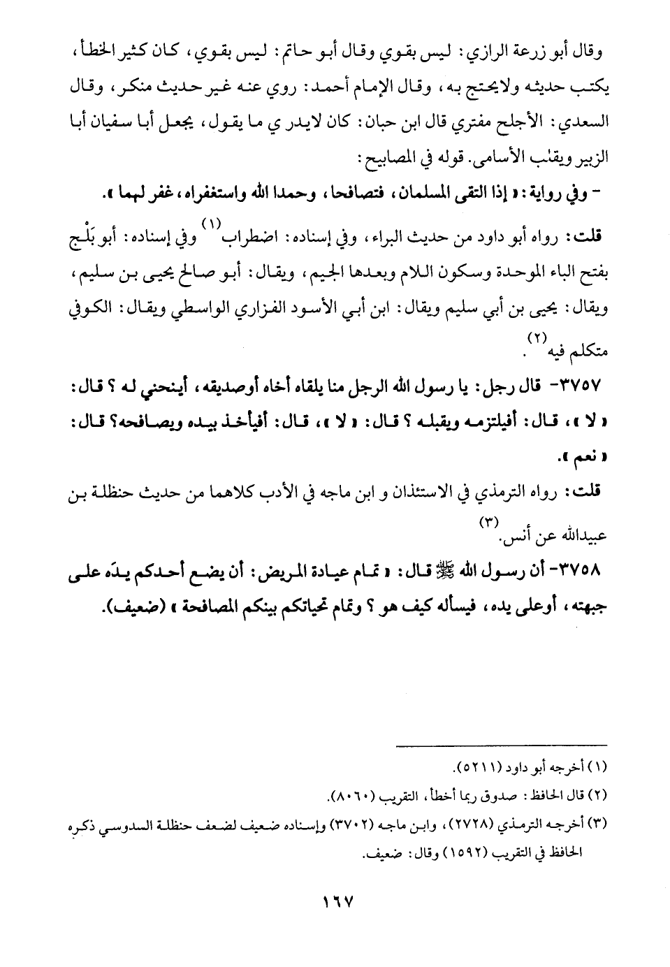 3757 - قال رجل: يا رسول الله الرجل منا يلقاه أخاه أو صديقه، أينحني له؟ قال: "لا"، قال: أفيلتزمه ويقبله؟ قال: "لا"، قال: أفيأخذ بيده ويصافحه؟ قال: "نعم".