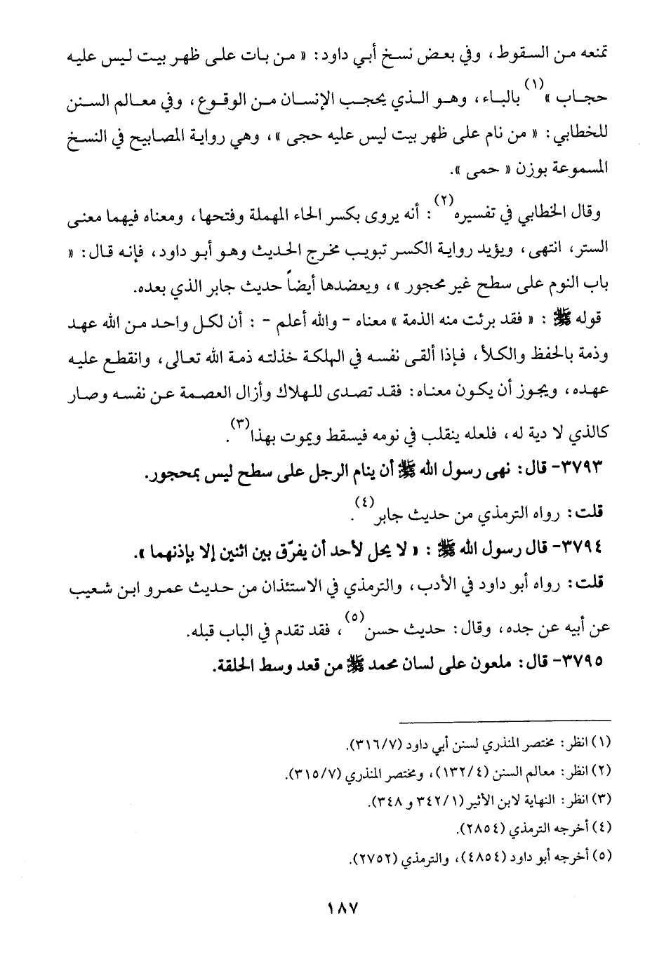 تمنعه من السقوط، وفي بعض نسخ أبي داود: "من بات على ظهر بيت ليس عليه حجاب" (¬1) بالباء، وهو الذي يحجب الإنسان من الوقوع، وفي معالم السنن للخطابي: "من نام على ظهر بيت ليس عليه حجى"، وهي رواية المصابيح في النسخ المسموعة بوزن "حمى".