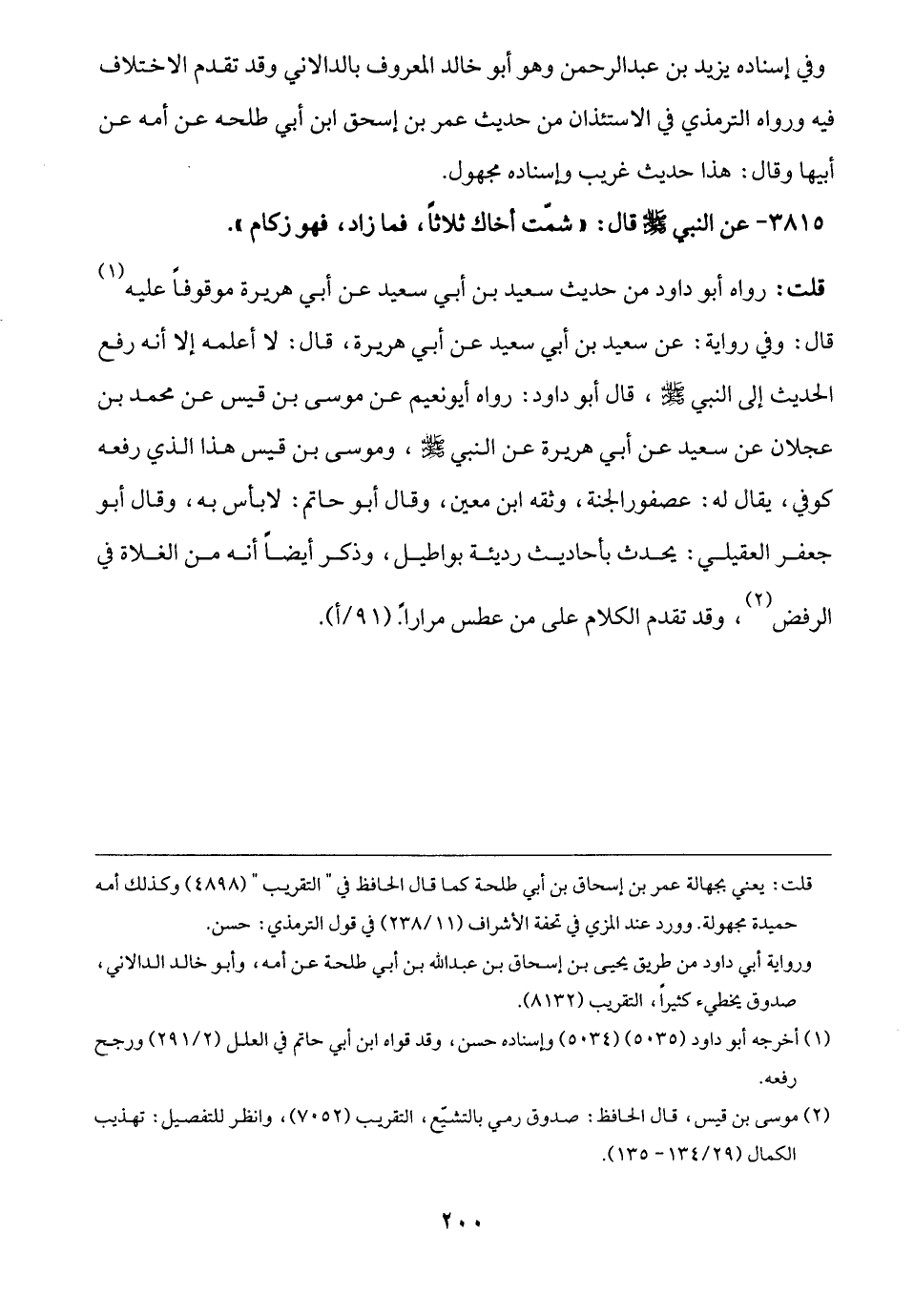 = قلت: يعني بجهالة عمر بن إسحاق بن أبي طلحة كما قال الحافظ في "التقريب" (4898) وكذلك أمه حميدة مجهولة. وورد عند المزي في تحفة الأشراف (11/ 238) في قول الترمذي: حسن.