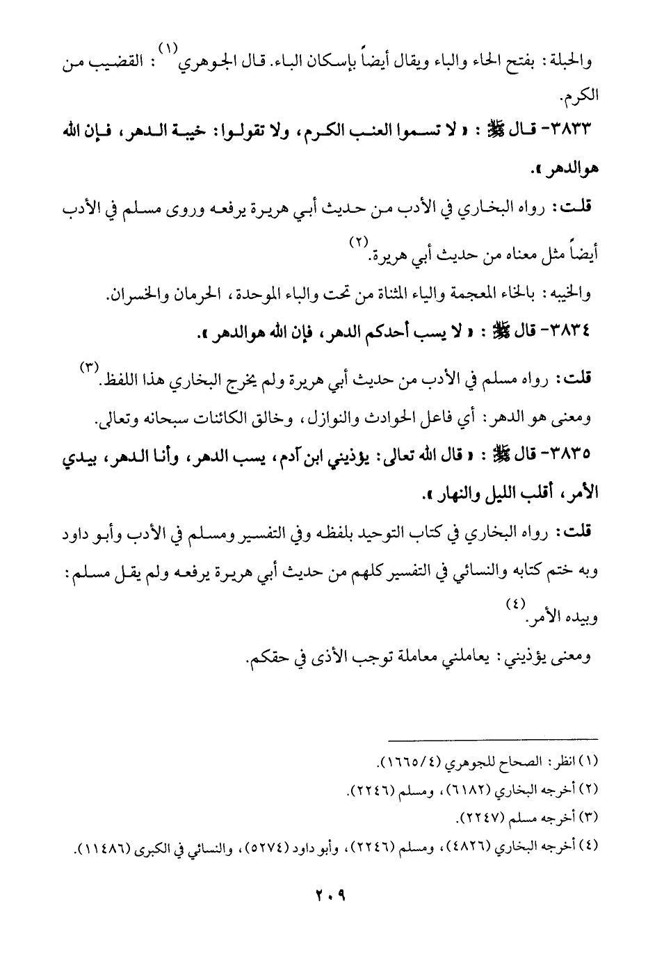 3834 - قال - صلى الله عليه وسلم -: "لا يسب أحدكم الدهر، فإن الله هو الدهر".