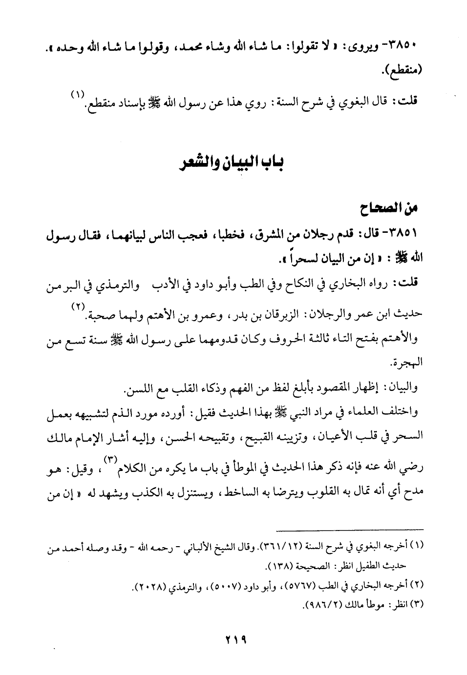 3851 - قال: قدم رجلان من المشرق، فخطبا، فعجب الناس لبيانهما، فقال رسول الله - صلى الله عليه وسلم -: "إن من البيان لسحرًا".