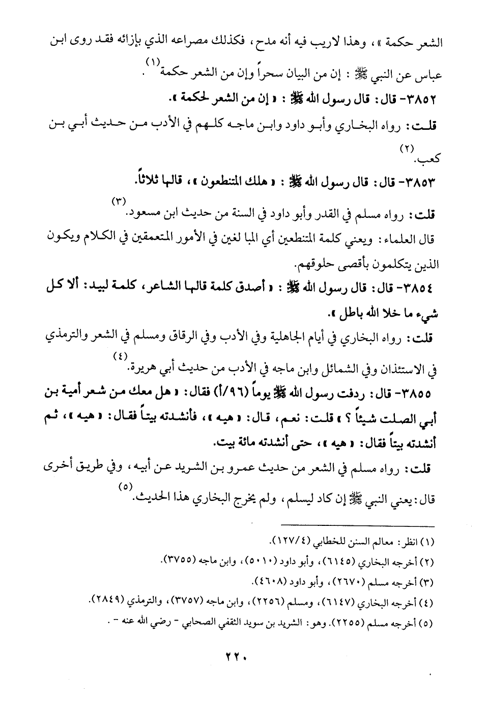 3855 - قال: ردفت رسول الله -صلى الله عليه وسلم- يومًا فقال: "هل معك من شعر أمية بن أبي الصلت شيئًا؟ " قلت: نعم، قال: "هيه"، فأنشدته بيتًا فقال: "هيه"، ثمَّ أنشدته بيتًا فقال: "هيه"، حتى أنشدته مائة بيت.