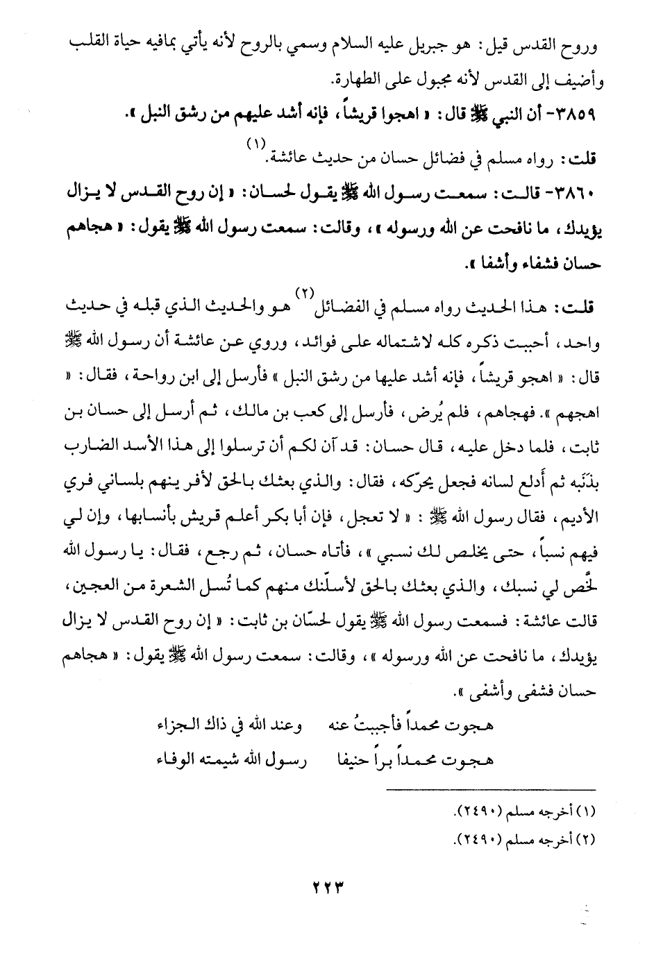3860 - قالت: سمعت رسول الله -صلى الله عليه وسلم- يقول لحسان: "إن روح القدس لا يزال يؤيدك، ما نافحت عن الله ورسوله"، وقالت: سمعت رسول الله -صلى الله عليه وسلم- يقول: "هجاهم حسان فشفاء وأشفا".