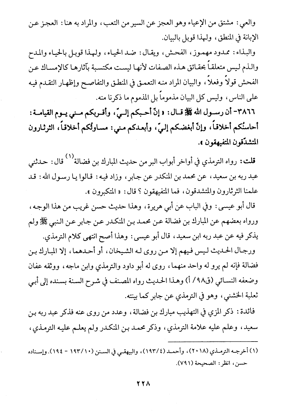 3866 - أن رسول الله -صلى الله عليه وسلم- قال: "إنّ أحبكم إليّ، وأقربكم مني يوم القيامة: أحاسنكم أخلاقًا، وإن أبغضكم إليّ، وأبعدكم مني: مساوئُكم أخلاقًا، الثرثارون المتشدّقون المتفيهقون".