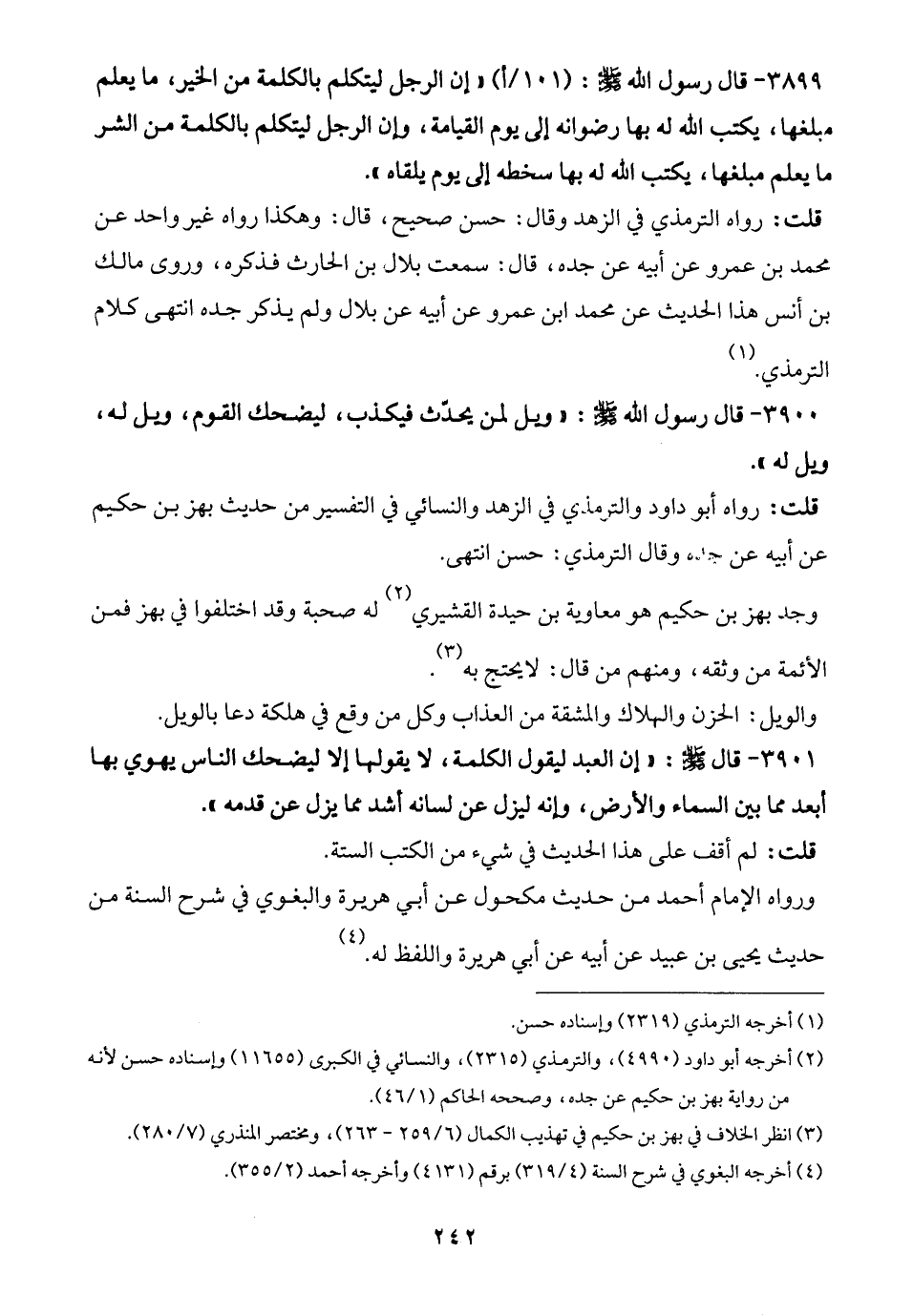 3899 - قال رسول الله -صلى الله عليه وسلم-: "إن الرجل ليتكلم بالكلمة من الخير، ما يعلم مبلغها، يكتب الله له بها رضوانه إلى يوم القيامة، وإن الرجل ليتكلم بالكلمة من الشر ما يعلم مبلغها، يكتب الله له بها سخطه إلى يوم يلقاه".