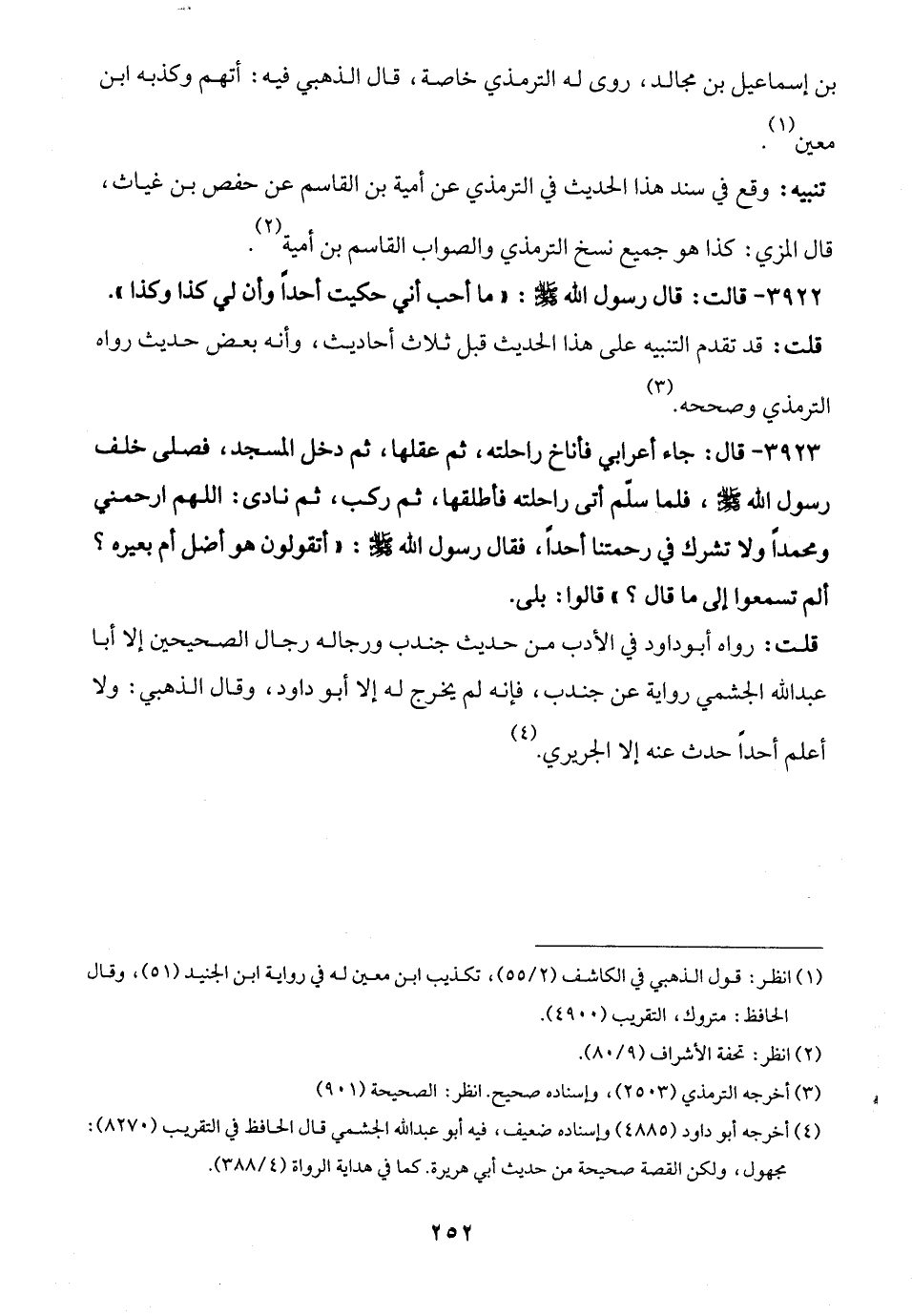 3923 - قال: جاء أعرابي فأناخ راحلته، ثم عقلها، ثم دخل المسجد، فصلى خلف رسول الله -صلى الله عليه وسلم-، فلما سلّم أتى راحلته فأطلقها، ثم ركب، ثم نادى: اللهم ارحمني ومحمدًا ولا تشرك في رحمتنا أحدًا، فقال رسول الله -صلى الله عليه وسلم-: "أتقولون هو أضل أم بعيره؟ ألم تسمعوا إلى ما قال؟ " قالوا: بلى.