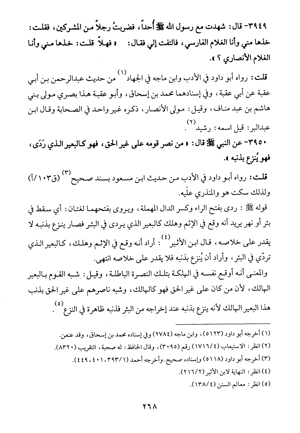 3949 - قال: شهدت مع رسول الله -صلى الله عليه وسلم- أحدًا، فضربتُ رجلًا من المشركين، فقلت: خذها مني وأنا الغلام الفارسي، فالتفت إلي فقال: "فهلّا قلت: خذها مني وأنا الغلام الأنصاري؟ ".