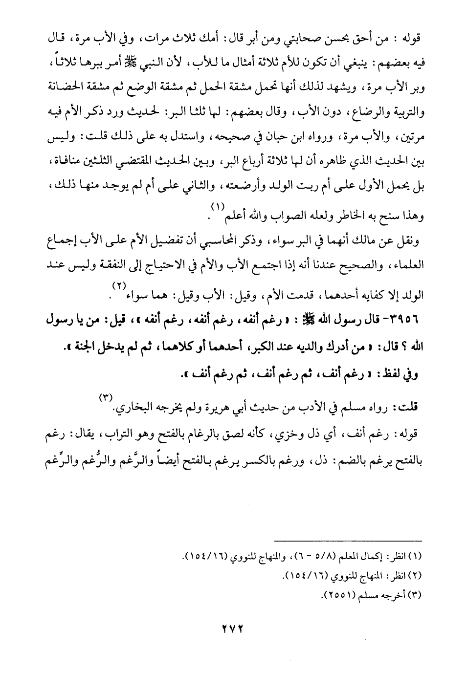 قوله: من أحق بحسن صحابتي ومن أبر قال: أمك ثلاث مرات، وفي الأب مرة، قال فيه بعضهم: ينبغي أن تكون للأم ثلاثة أمثال ما للأب، لأنَّ النبي -صلى الله عليه وسلم- أمر ببرها ثلاثًا، وبر الأب مرة، ويشهد لذلك أنها تحمل مشقة الحصل ثمَّ مشقة الوضع ثمَّ مشقة الحضانة والتربية والرضاع، دون الأب، وقال بعضهم: لها ثلثا البر: لحديث ورد ذكر الأم فيه مرتين، والأب مرة، ورواه ابن حبَّان في صحيحه، واستدل به على ذلك قلت: وليس بين الحديث الذي ظاهره أن لها ثلاثة أرباع البر، وبين الحديث المقتضي الثلثين منافاة، بل يحمل الأول على أم ربت الولد وأرضعته، والثاني على أم لم يوجد منها ذلك، وهذا سنح به الخاطر ولعله الصواب والله أعلم (¬1).