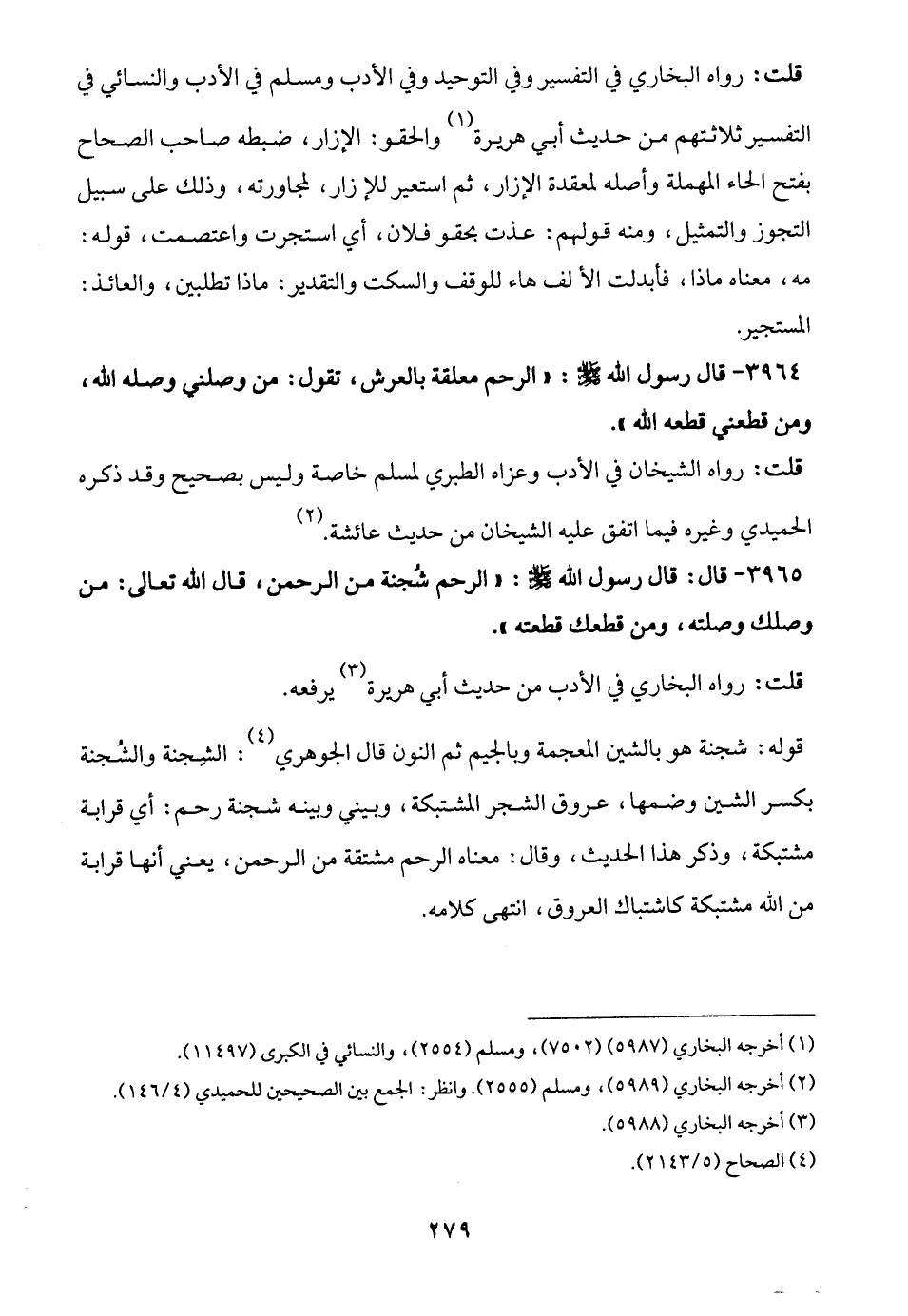 3965 - قال: قال رسول الله -صلى الله عليه وسلم-: "الرحم شُجنة من الرحمن، قال الله تعالى: من وصلك وصلته، ومن قطعك قطعته".