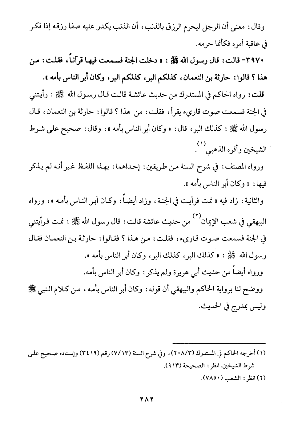 قلت: رواه الحاكم في المستدرك من حديث عائشة قالت قال رسول الله -صلى الله عليه وسلم-: رأيتني في الجنة فسمعت صوت قارئ يقرأ، فقلت: من هذا؟ قالوا: حارثة بن النعمان، قال رسول الله -صلى الله عليه وسلم-: كذلك البر، قال: "وكان أبر الناس بأمه"، وقال: صحيح على شرط الشيخين وأقره الذهبي (¬1).