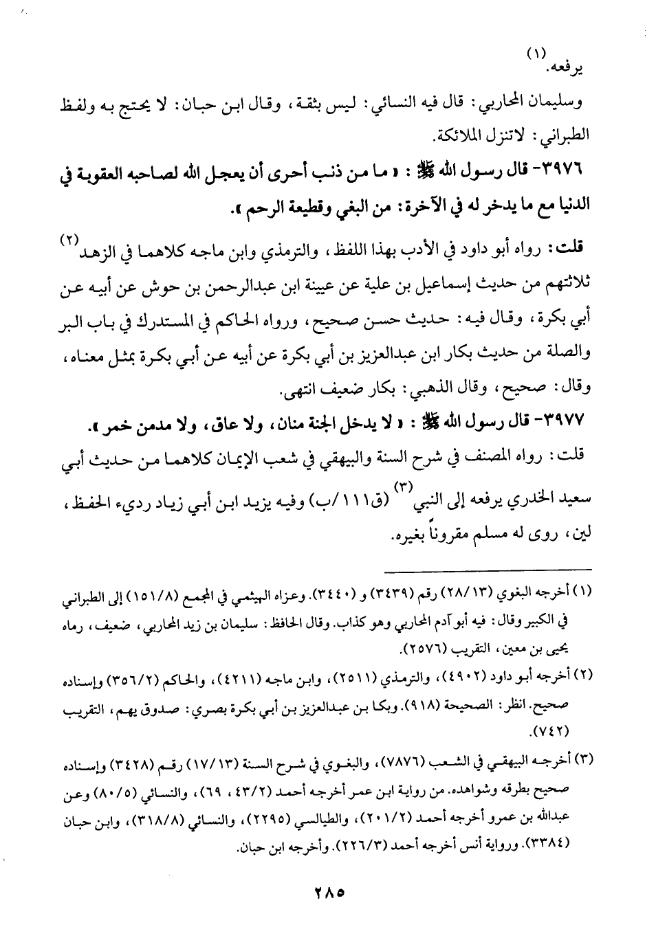 3977 - قال رسول الله -صلى الله عليه وسلم-: "لا يدخل الجنة منان، ولا عاق، ولا مدمن خمر".