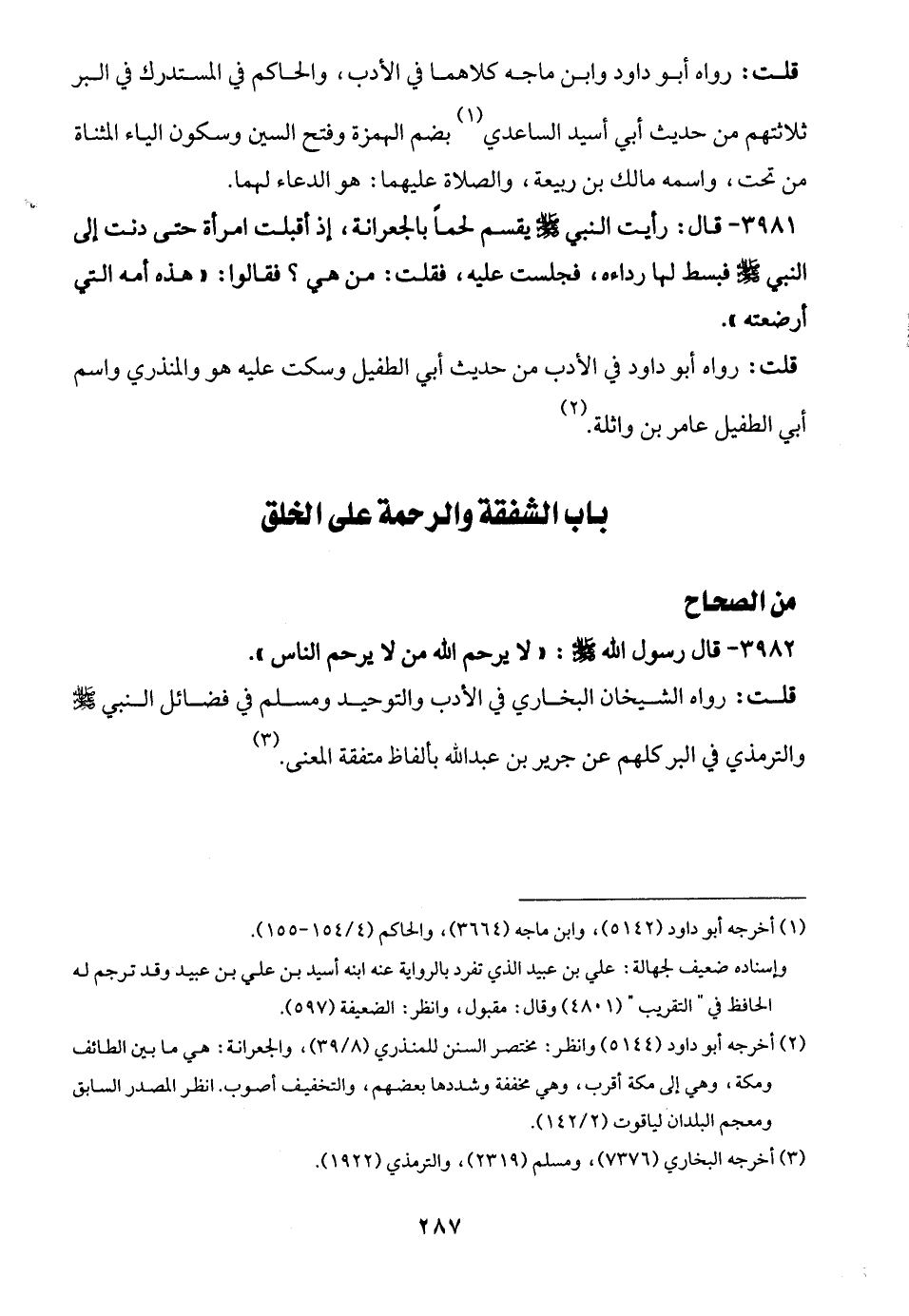 قلت: رواه الشيخان البخاري في الأدب والتوحيد ومسلم في فضائل النبي -صلى الله عليه وسلم- والترمذي في البر كلهم عن جرير بن عبد الله بألفاظ متفقة المعنى. (¬3)
