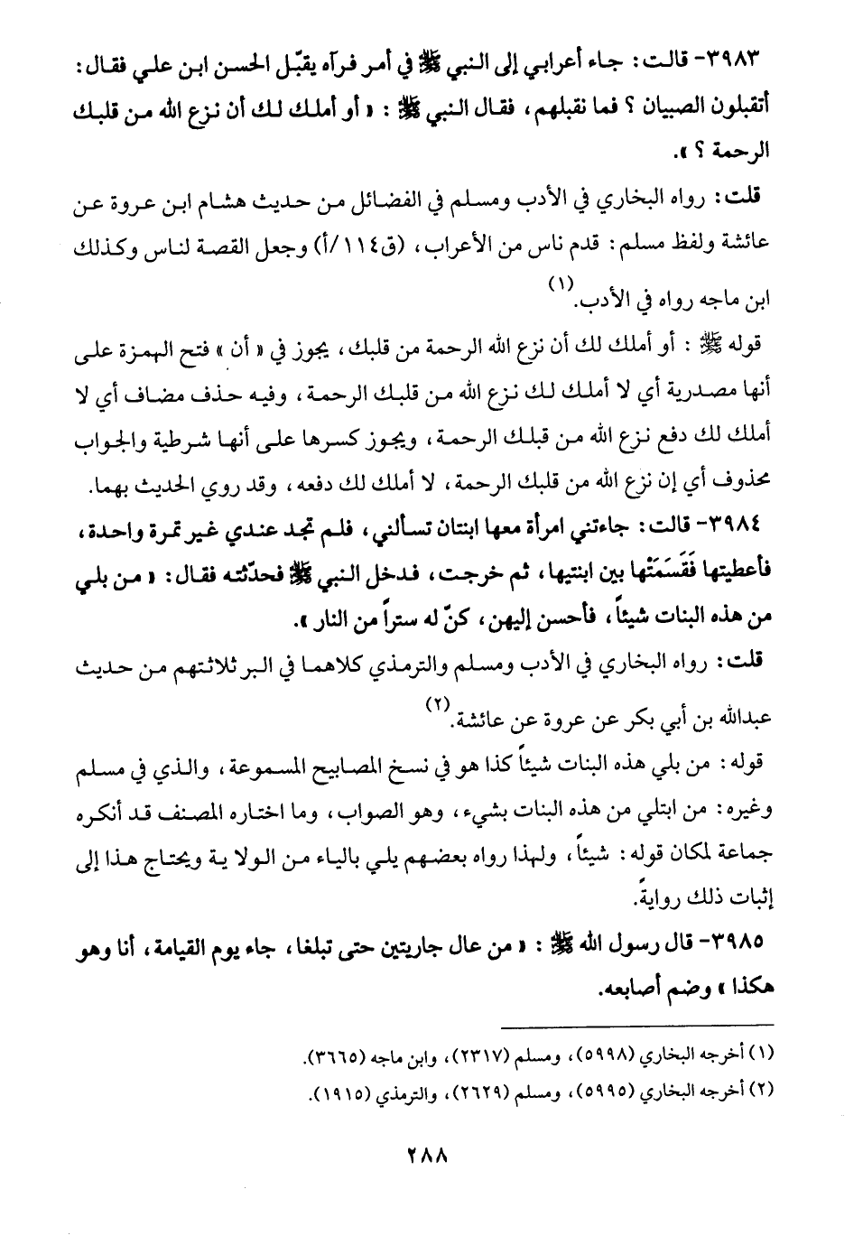 3985 - قال رسول الله -صلى الله عليه وسلم-: "من عال جاريتين حتى تبلغا، جاء يوم القيامة، أنا وهو هكذا" وضم أصابعه.