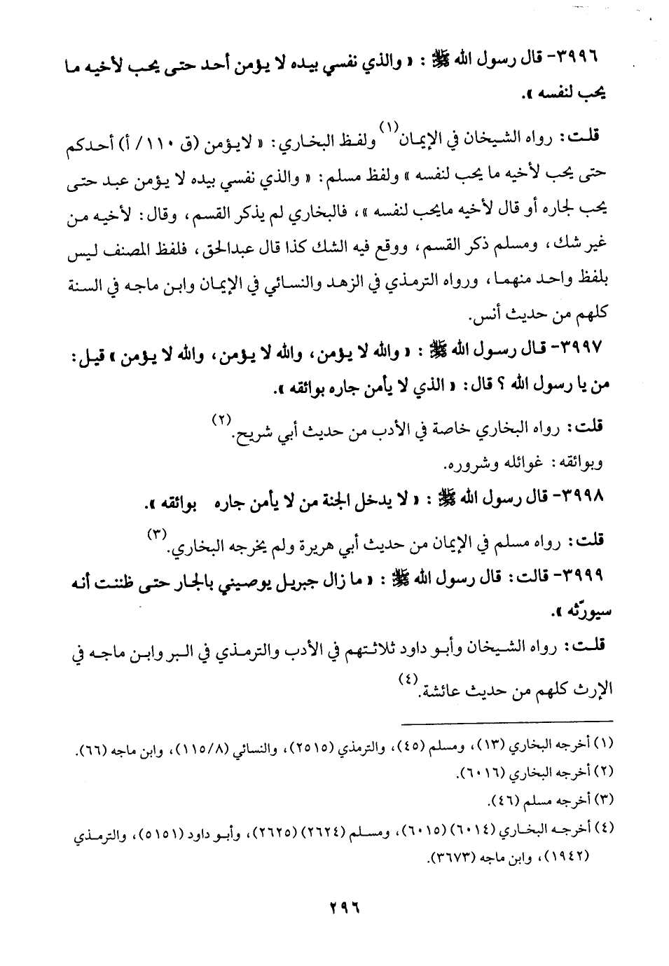 3996 - قال رسول الله -صلى الله عليه وسلم-: "والذي نفسي بيده لا يؤمن أحد حتى يحب لأخيه ما يحب لنفسه".