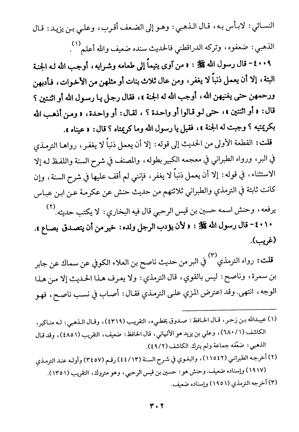 قلت: القطعة الأولى من الحديث إلى قوله: إلا أن يعمل ذنبًا لا يغفر، رواها الترمذي في البر، ورواه الطبراني في معجمه الكبير بطوله، والمصنف في شرح السنة واللفظ له إلا الاستثناء، في قوله: إلا أن يعمل ذنبا لا يغفر، فإنني لم أقف عليها في شرح السنة، وإن كانت ثابتة في الترمذي والطبراني ثلاثتهم من حديث حنش عن عكرمة عن ابن عباس يرفعه، وحنش اسمه حسين بن قيس الرحبي قال فيه البخاري: لا يكتب حديثه. (¬2)