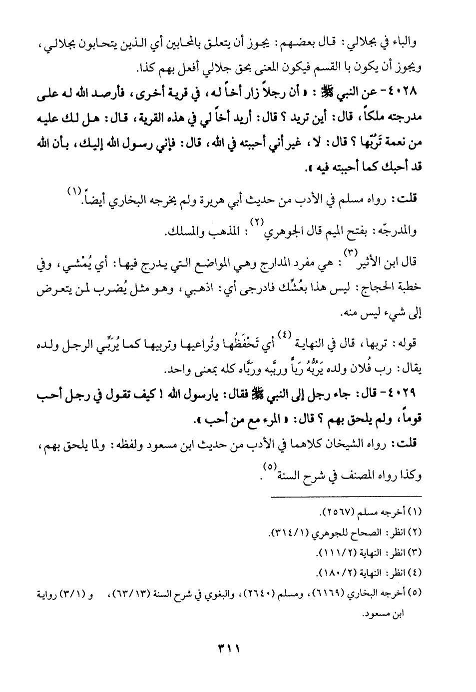 4028 - عن النبي -صلى الله عليه وسلم-: "أن رجلًا زار أخًا له، في قرية أخرى، فأرصد الله له على مدرجته ملكًا، قال: أين تريد؟ قال: أريد أخًا لي في هذه القرية، قال: هل لك عليه من نعمة تَرُبّها؟ قال: لا، غير أني أحببته في الله، قال: فإني رسول الله إليك، بأن الله قد أحبك كما أحببته فيه".