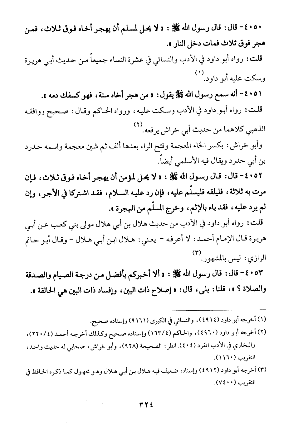 4052 - قال: قال رسول الله - صلى الله عليه وسلم -: "لا يحل لمؤمن أن يهجر أخاه فوق ثلاث، فإن مرت به ثلاثة، فليلقه فليسلّم عليه، فإن رد عليه السلام، فقد اشتركا في الأجر، وإن لم يرد عليه، فقد باء بالإثم، وخرج المسلّم من الهجرة".