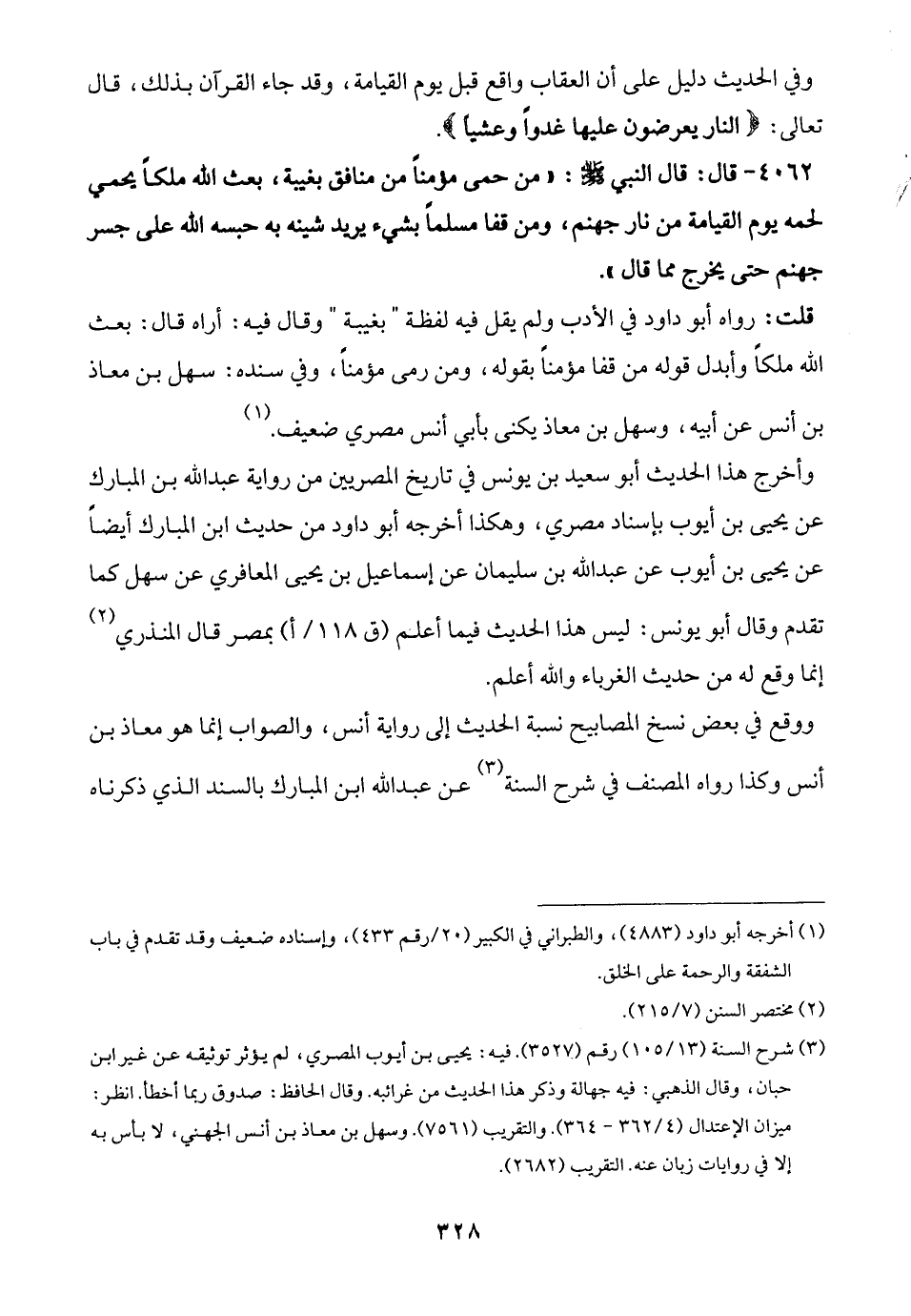 (¬3) شرح السنة (13/ 105) رقم (3527). فيه: يحيى بن أيوب المصري، لم يؤثر توثيقه عن غير ابن حبان، وقال الذهبي: فيه جهالة وذكر هذا الحديث من غرائبه. وقال الحافظ: صدوق ربما أخطأ. انظر: ميزان الاعتدال (4/ 362 - 364). والتقريب (7561). وسهل بن معاذ بن أنس الجهني، لا بأس به إلا في روايات زبان عنه. التقريب (2682).