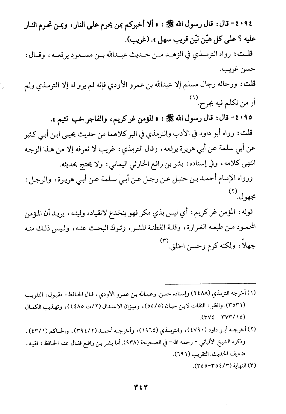 (¬2) أخرجه أبو داود (4790)، والترمذي (1964)، وأخرجه أحمد (2/ 394)، والحاكم (1/ 43)، وذكره الشيخ الألباني - رحمه الله - في الصحيحة (938). أما بشر بن رافع فقال عنه الحافظ: فقيه، ضعيف الحديث. التقريب (691).