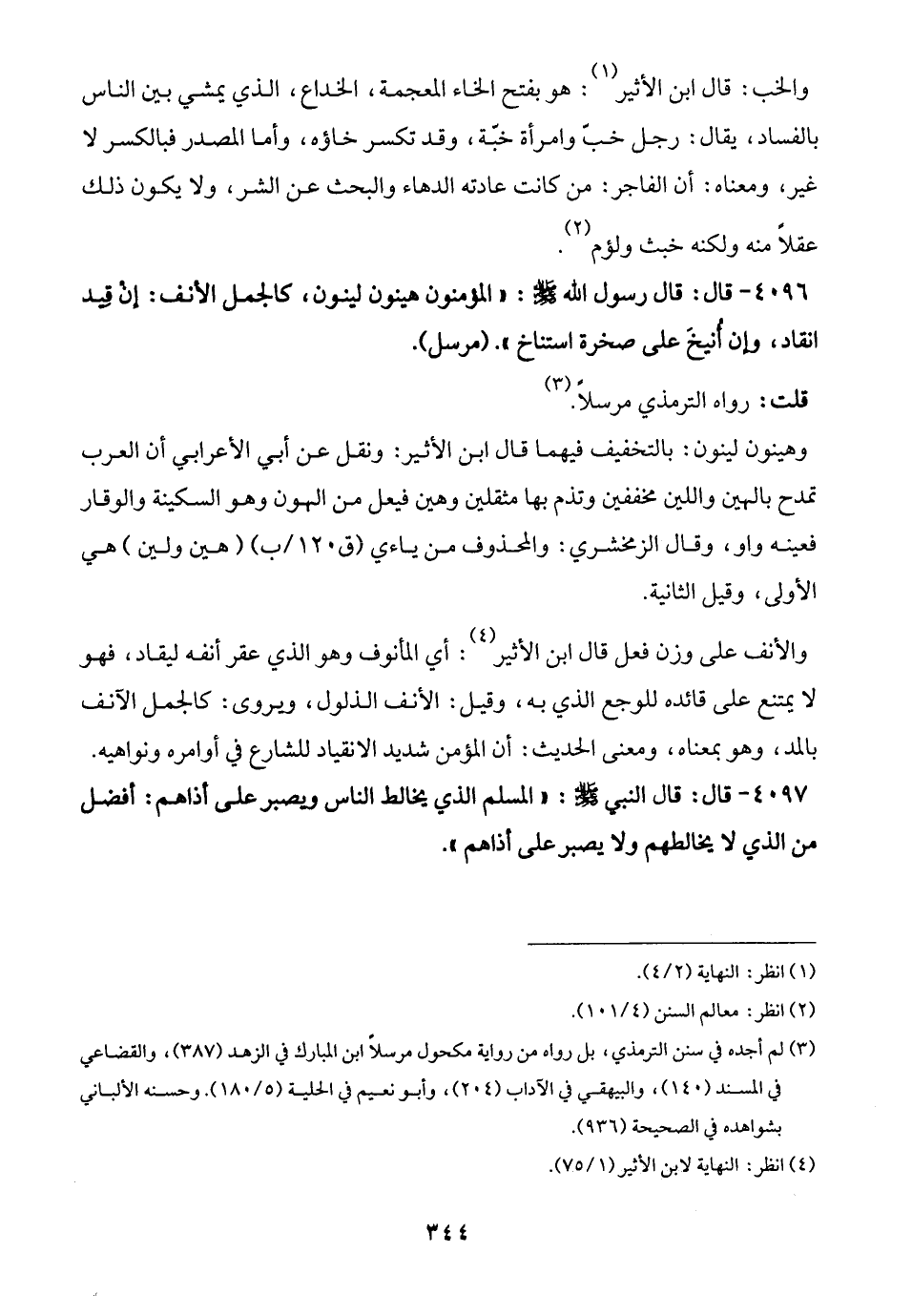 4096 - قال: قال رسول الله - صلى الله عليه وسلم -: "المؤمنون هينون لينون، كالجمل الأنف: إن قِيد انقاد، وإن أُنيخَ على صخرة استناخ". (مرسل).