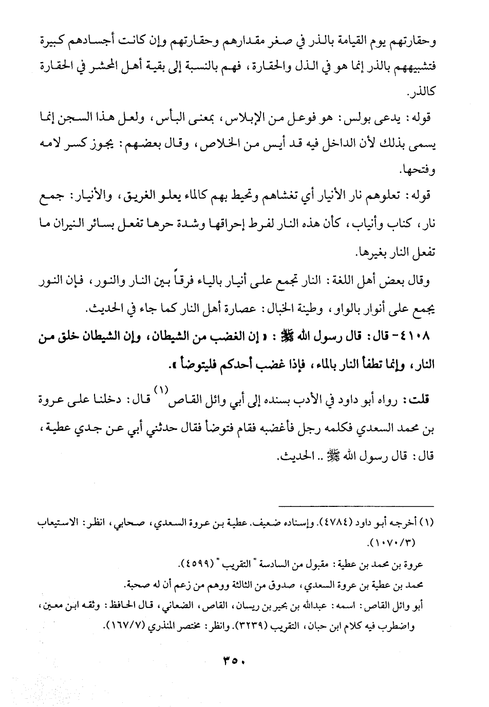 4108 - قال: قال رسول الله - صلى الله عليه وسلم -: "إن الغضب من الشيطان، وإن الشيطان خلق من النار، وإنما تطفأ النار بالماء، فإذا غضب أحدكم فليتوضأ".