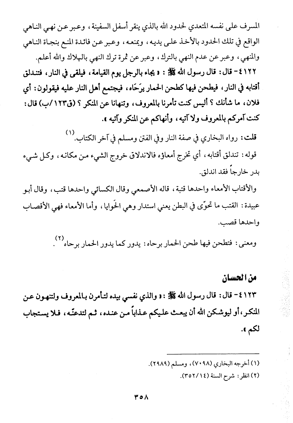 4122 - قال: قال رسول الله - صلى الله عليه وسلم -: "يجاء بالرجل يوم القيامة، فيلقى في النار، فتندلق أقتابه في النار، فيطحن فيها كطحن الحمار يرَحَاه، فيجتمع أهل النار عليه فيقولون: أي فلان، ما شأنك؟ أليس كنت تأمرنا بالمعروف، وتنهانا عن المنكر؟ قال: كنت آمركم بالمعروف ولا آتيه، وأنهاكم عن المنكر وآتيه".