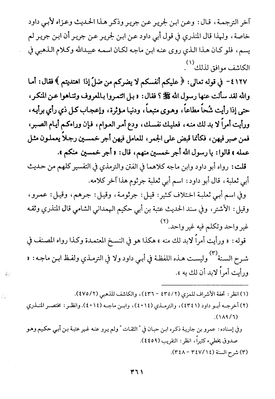4127 - في قوله تعالى: {عَلَيْكُمْ أَنْفُسَكُمْ لَا يَضُرُّكُمْ مَنْ ضَلَّ إِذَا اهْتَدَيْتُمْ} فقال: أما والله لقد سألت عنها رسول الله - صلى الله عليه وسلم -؟ فقال: "بل ائتمروا بالمعروف وتناهوا عن المنكر، حتى إذا رأيت شُحًّا مطاعًا، وهوى متبعًا، ودنيا مؤثرة، وإعجاب كل ذي رأي برأيه، ورأيت أمرًا لا بد لك منه، فعليك نفسك، ودع أمر العوام، فإن وراءكم أيام الصبر، فمن صبر فيهن، فكأنما قبض على الجمر، للعامل فيهن أجر خمسين رجلًا يعملون مثل عمله" قالوا: يا رسول الله أجر خمسين منهم، قال: "أجر خمسين منكم".
