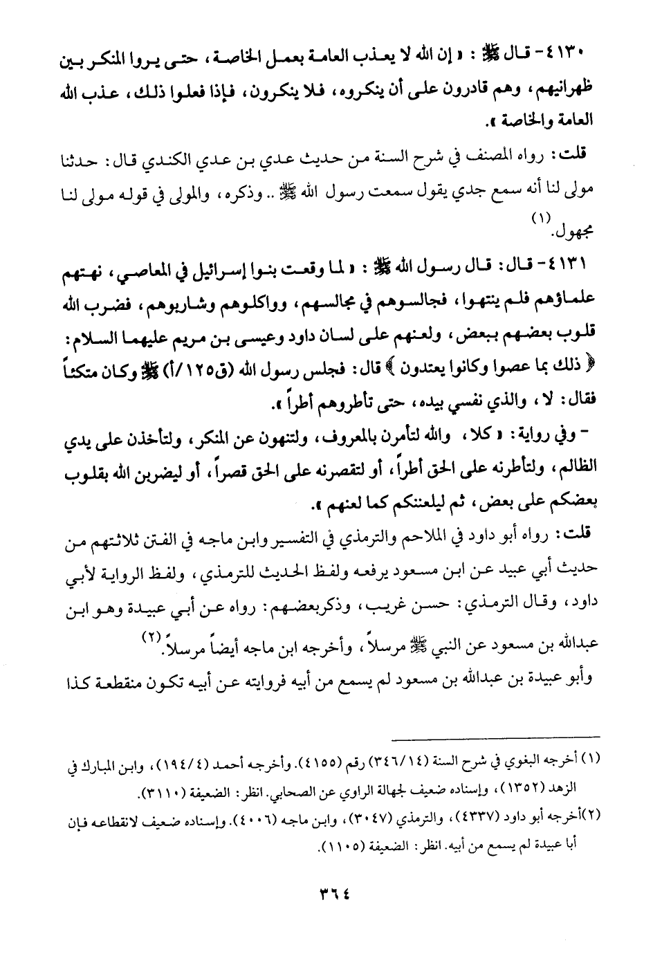 4130 - قال - صلى الله عليه وسلم -: "إن الله لا يعذب العامة بعمل الخاصة، حتى يروا المنكر بين ظهرانيهم، وهم قادرون على أن ينكروه، فلا ينكرون، فإذا فعلوا ذلك، عذب الله العامة والخاصة".