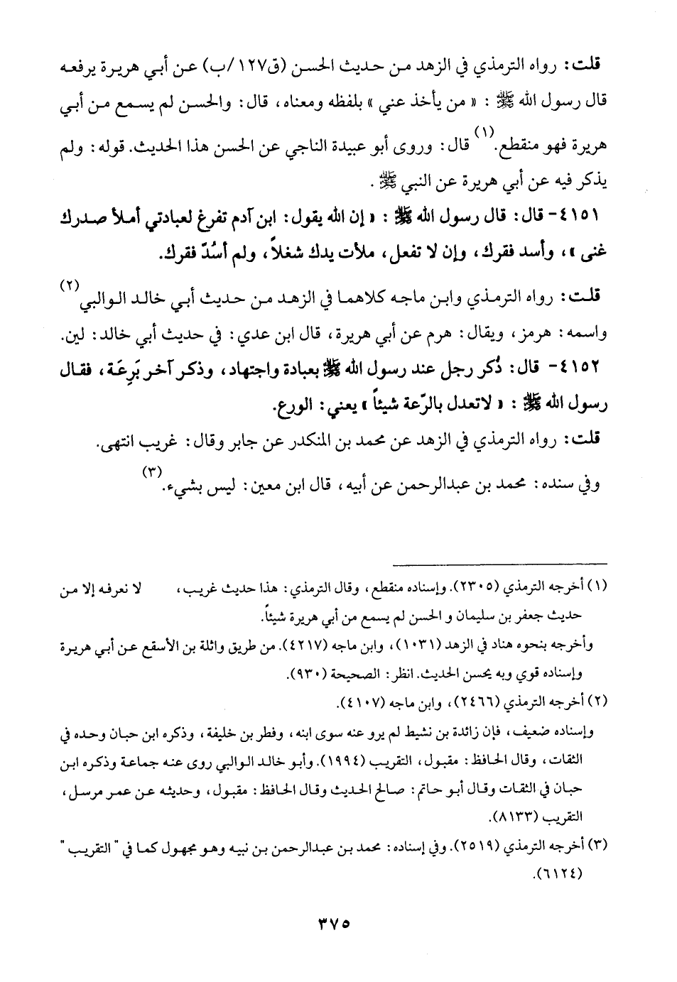 قلت: رواه الترمذي في الزهد من حديث الحسن عن أبي هريرة يرفعه قال رسول الله - صلى الله عليه وسلم -: "من يأخذ عني" بلفظه ومعناه، قال: والحسن لم يسمع من أبي هريرة فهو منقطع. (¬1) قال: وروى أبو عبيدة الناجي عن الحسن هذا الحديث. قوله: ولم يذكر فيه عن أبي هريرة عن النبي - صلى الله عليه وسلم -.