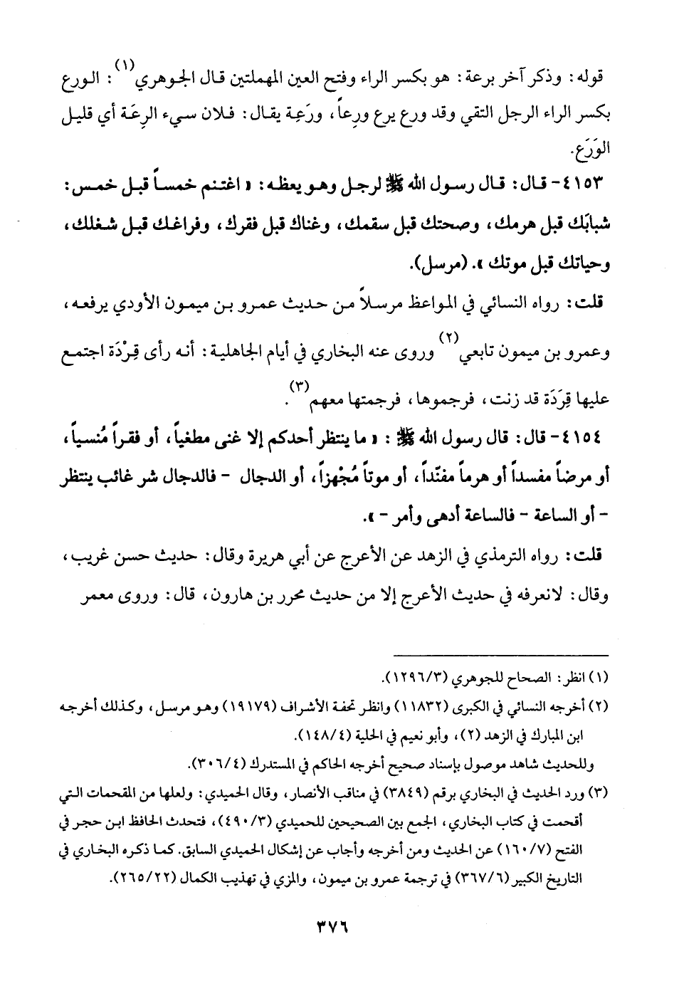 4153 - قال: قال رسول الله - صلى الله عليه وسلم - لرجل وهو يعظه: "اغتنم خمسًا قبل خمس: شبابَك قبل هرمك، وصحتك قبل سقمك، وغناك قبل فقرك، وفراغك قبل شغلك، وحياتك قبل موتك". (مرسل).