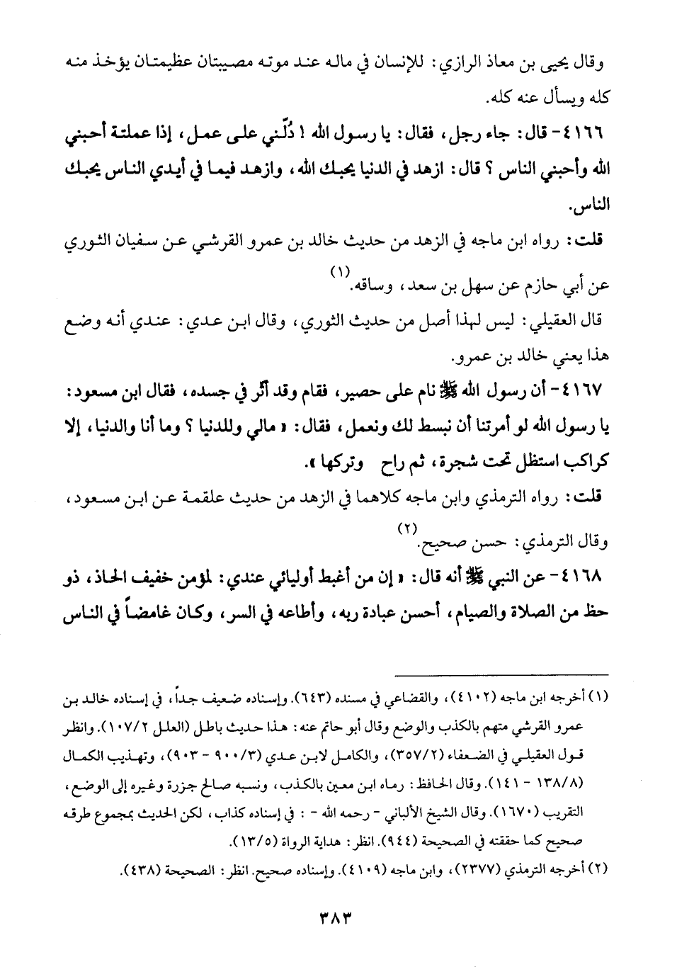 4166 - قال: جاء رجل، فقال: يا رسول الله! دُلّني على عمل، إذا عملتة أحبني الله وأحبني الناس؟ قال: ازهد في الدنيا يحبك الله، وازهد فيما في أيدي الناس يحبك الناس.