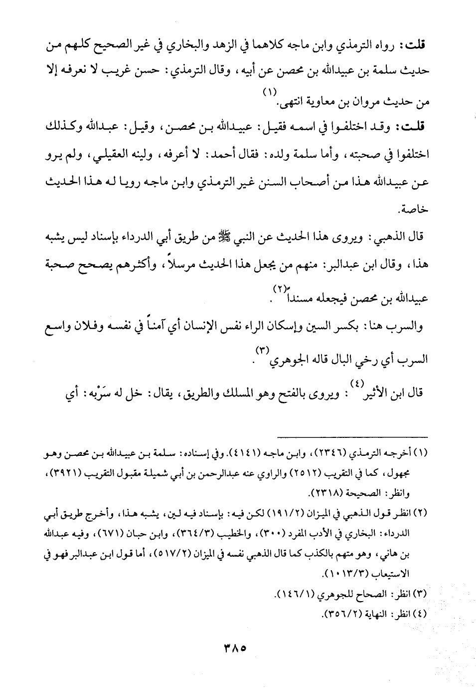 قال الذهبي: ويروى هذا الحديث عن النبي - صلى الله عليه وسلم - من طريق أبي الدرداء بإسناد ليس يشبه هذا، وقال ابن عبد البر: منهم من يجعل هذا الحديث مرسلًا، وأكثرهم يصحح صحبة عبيد الله بن محصن فيجعله مسندًا (¬2).
