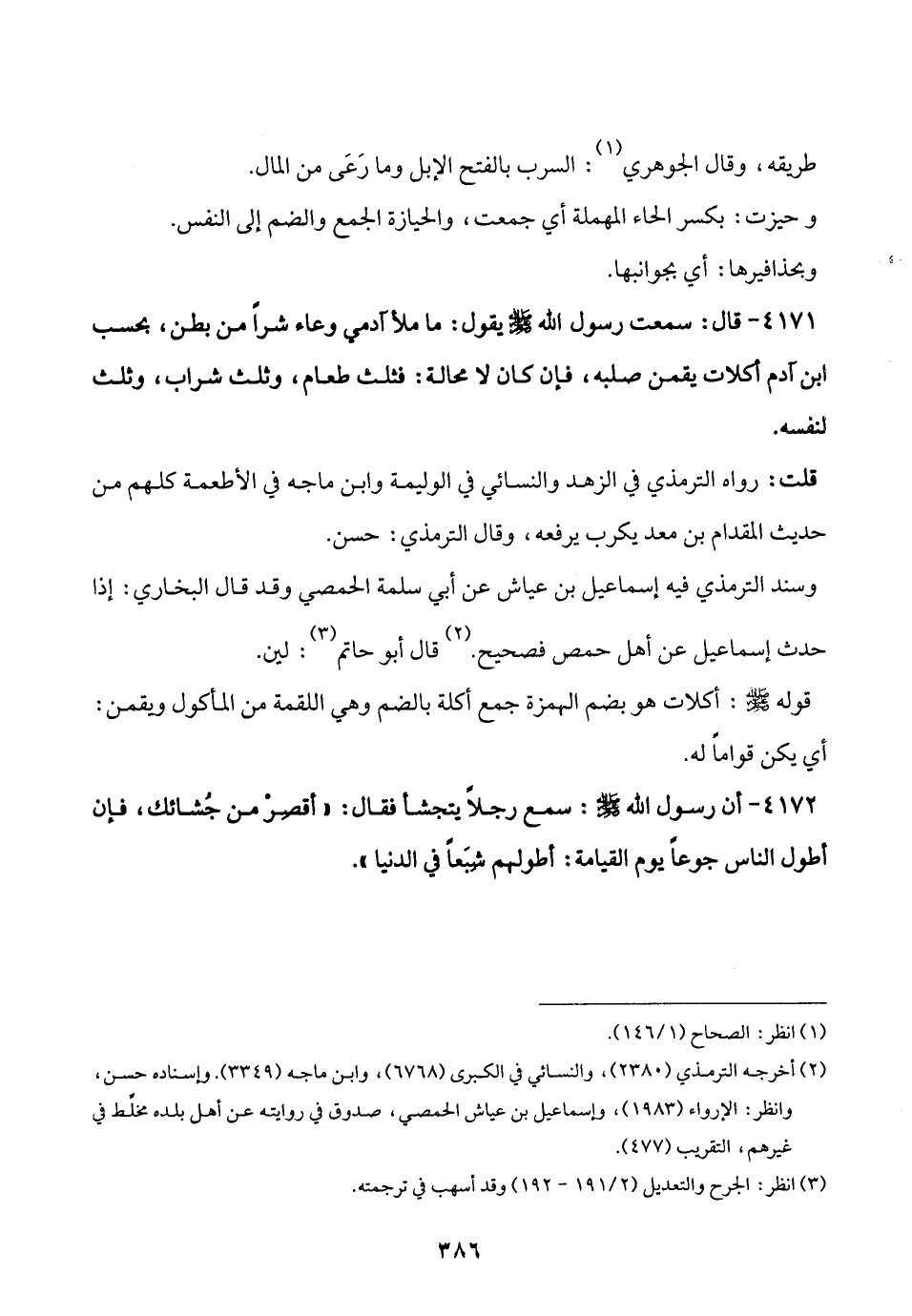 4171 - قال: سمعت رسول الله - صلى الله عليه وسلم - يقول: ما ملأ آدمي وعاء شرًّا من بطن، بحسب ابن آدم أكلات يقمن صلبه، فإن كان لا محالة: فثلث طعام، وثلث شراب وثلث لنفسه.