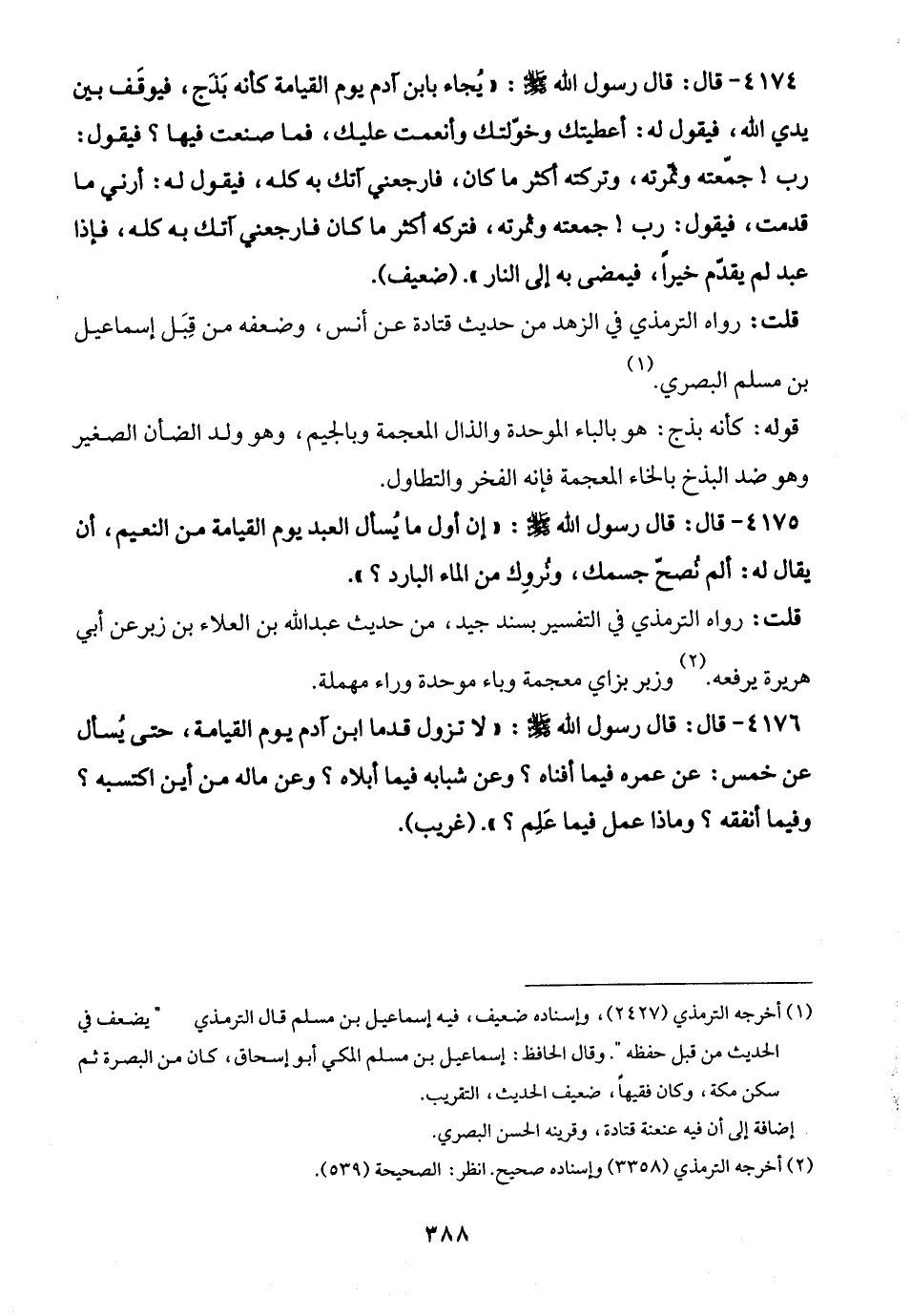 4176 - قال: قال رسول الله - صلى الله عليه وسلم -: "لا تزول قدما ابن آدم يوم القيامة، حتى يُسأل عن خمس: عن عمره فيما أفناه؟ وعن شبابه فيما أبلاه؟ وعن ماله من أين اكتسبه؟ وفيما أنفقه؟ وماذا عمل فيما عَلِم؟ ". (غريب).