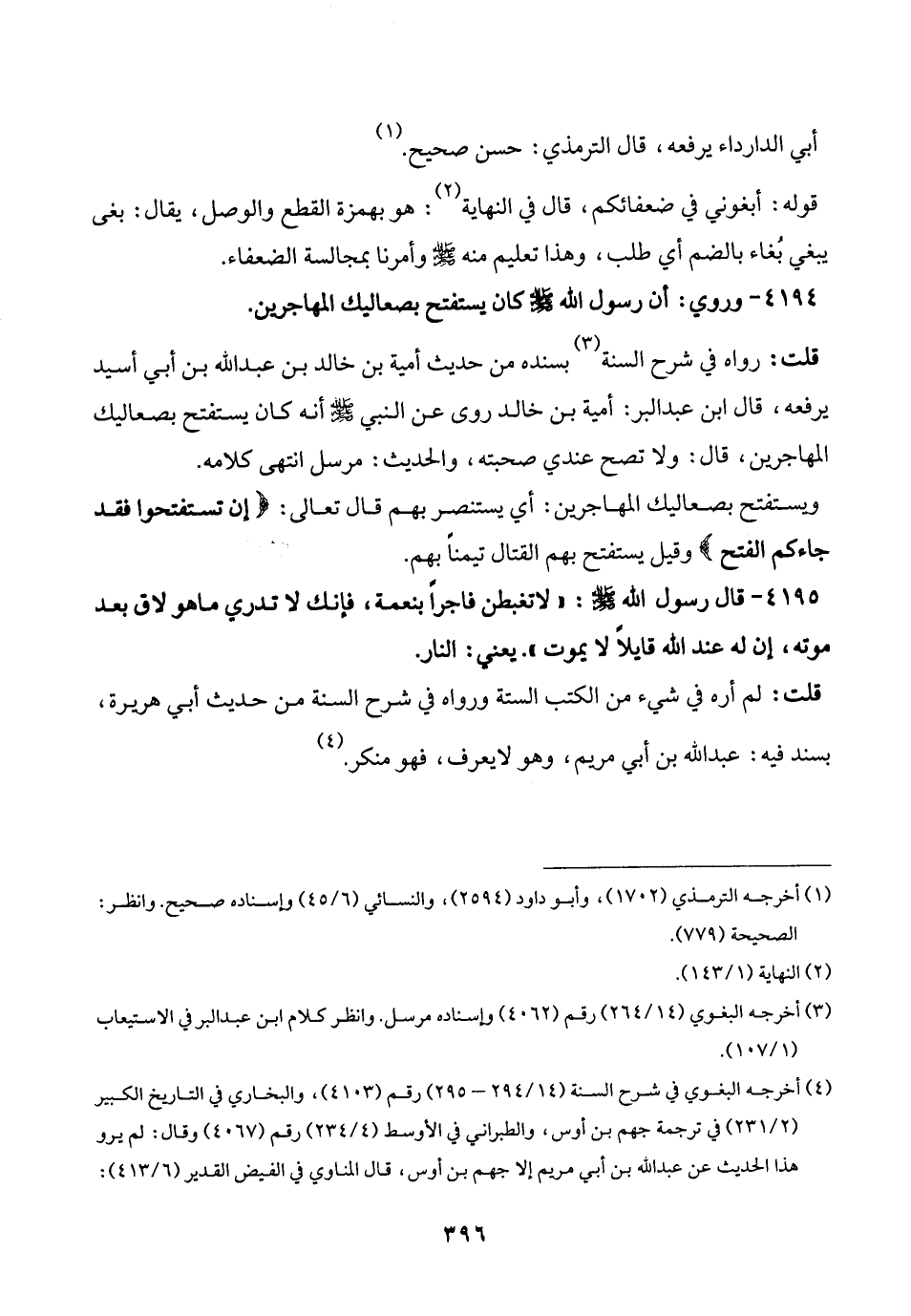 قلت: رواه في شرح السنة (¬3) بسنده من حديث أمية بن خالد بن عبد الله بن أبي أسيد يرفعه، قال ابن عبد البر: أمية بن خالد روى عن النبي - صلى الله عليه وسلم - أنه كان يستفتح بصعاليك المهاجرين، قال: ولا تصح عندي صحبته، والحديث: مرسل انتهى كلامه.
