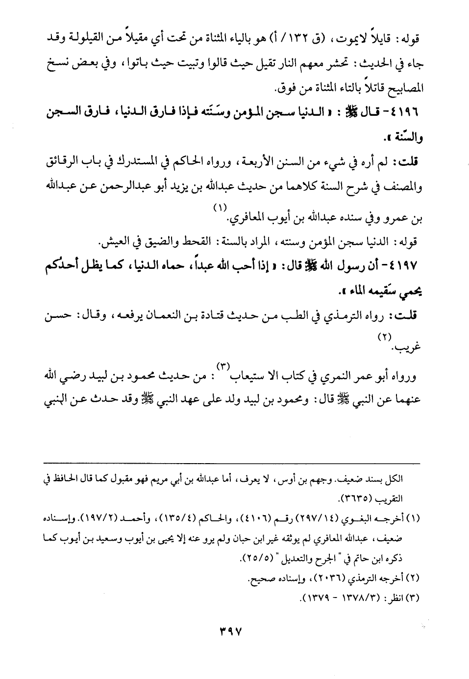 قلت: لم أره في شيء من السنن الأربعة، ورواه الحاكم في المستدرك في باب الرقائق والمصنف في شرح السنة كلاهما من حديث عبد الله بن يزيد أبو عبد الرحمن عن عبد الله بن عمرو وفي سنده عبد الله بن أيوب المعافري. (¬1)