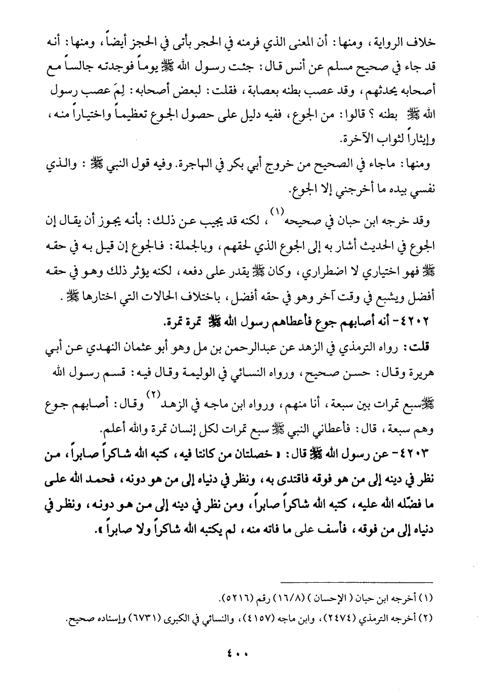 4203 - عن رسول الله - صلى الله عليه وسلم - قال: "خصلتان من كانتا فيه، كتبه الله شاكرًا صابرًا، من نظر في دينه إلى من هو فوقه فاقتدى به، ونظر في دنياه إلى من هو دونه، فحمد الله على ما فضّله الله عليه، كتبه الله شاكرًا صابرًا، ومن نظر في دينه إلى من هو دونه، ونظر في دنياه إلى من فوقه، فأسف على ما فاته منه، لم يكتبه الله شاكرًا ولا صابرًا".