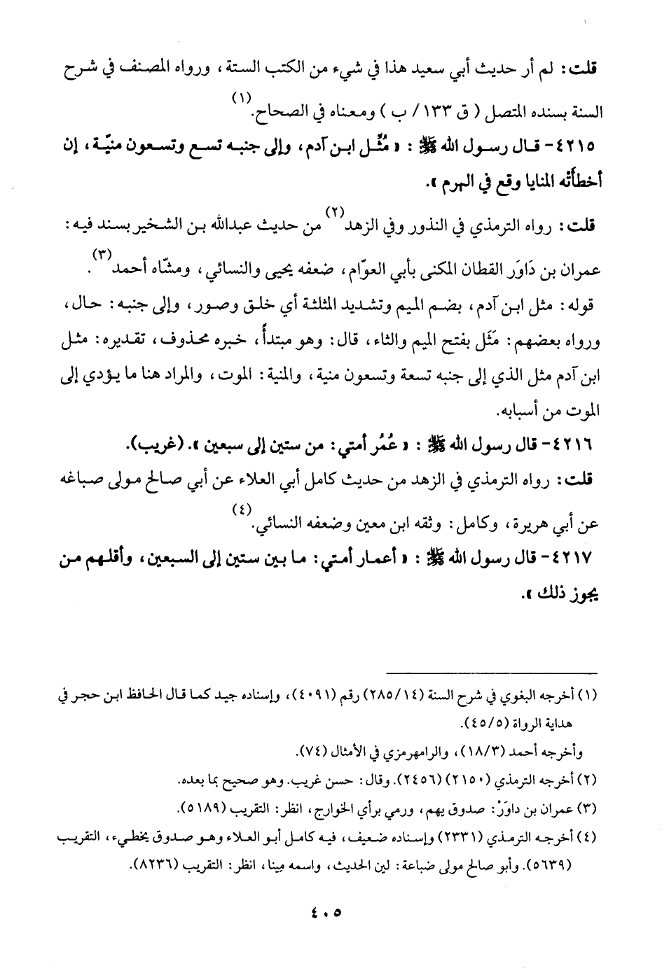 4216 - قال رسول الله - صلى الله عليه وسلم -: "عُمُر أمتي: من ستين إلى سبعين". (غريب).