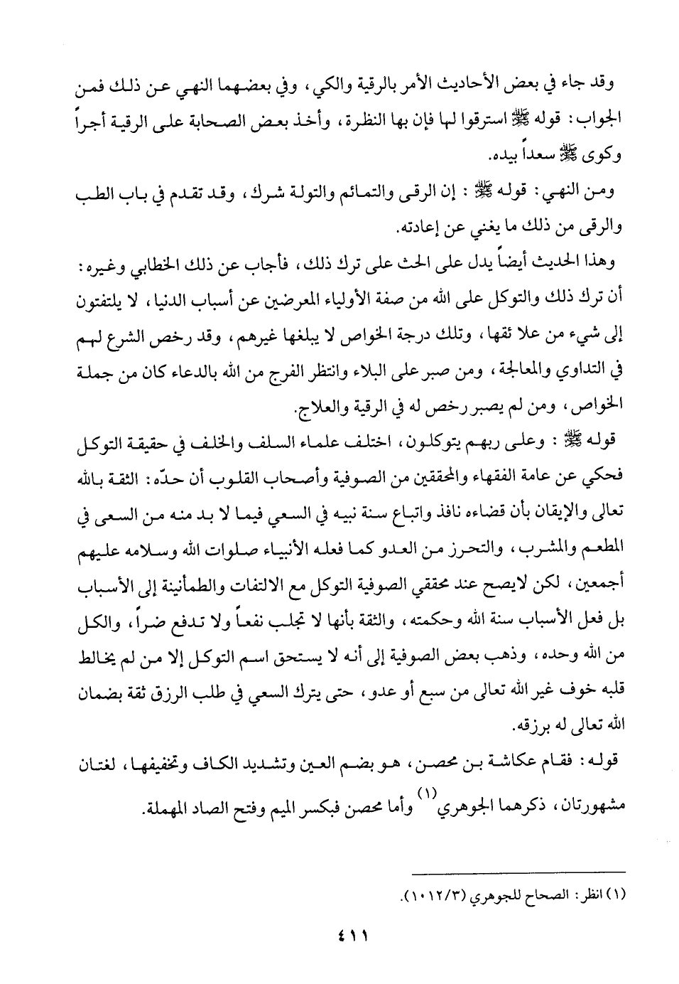 وهذا الحديث أيضًا يدل على الحث على ترك ذلك، فأجاب عن ذلك الخطابي وغيره: أن ترك ذلك والتوكل على الله من صفة الأولياء المعرضين عن أسباب الدنيا، لا يلتفتون إلى شيء من علائقها، وتلك درجة الخواص لا يبلغها غيرهم، وقد رخص الشرع لهم في التداوي والمعالجة، ومن صبر على البلاء وانتظر الفرج من الله بالدعاء كان من جملة الخواص، ومن لم يصبر رخص له في الرقية والعلاج.