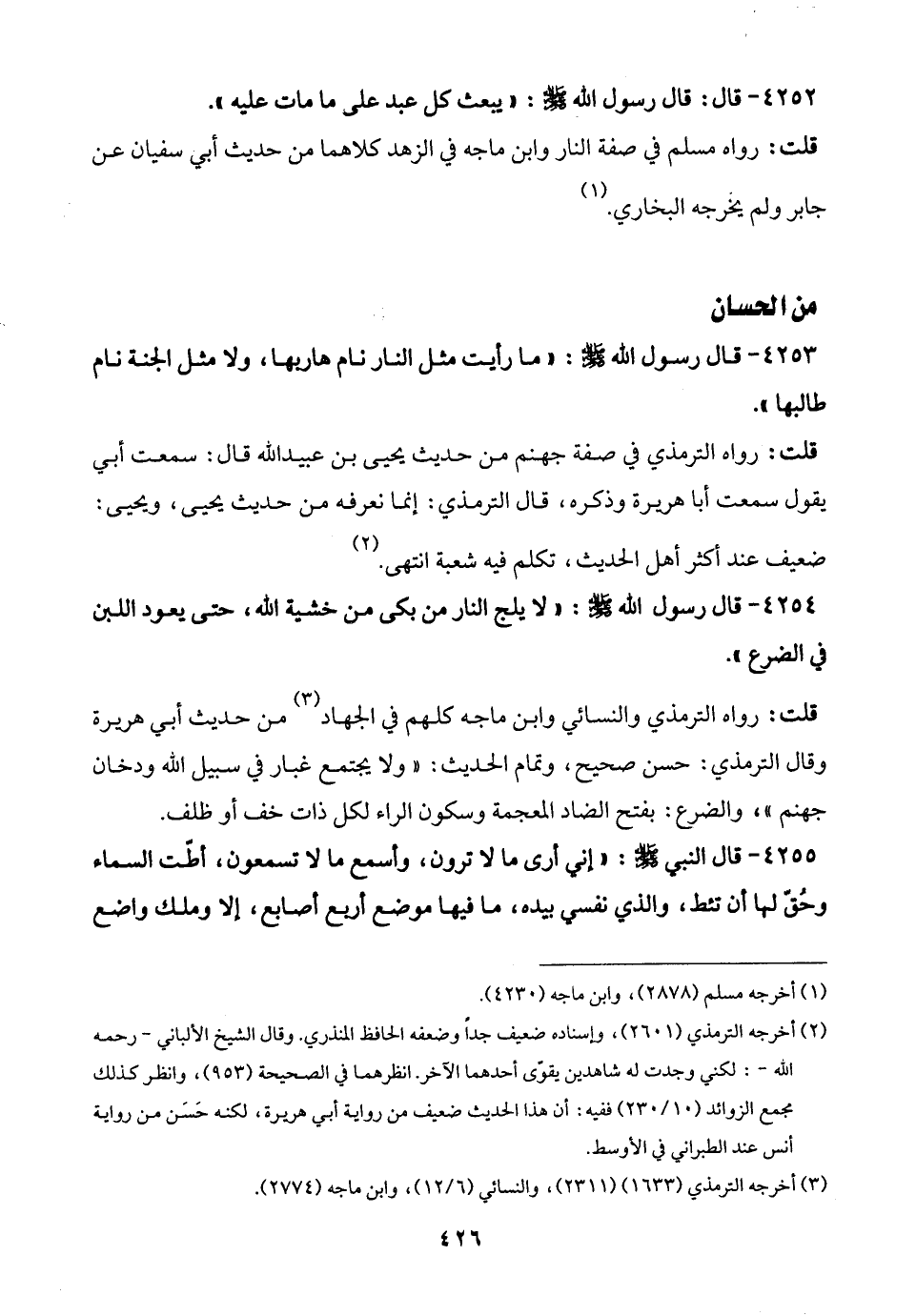 4253 - قال رسول الله - صلى الله عليه وسلم -: "ما رأيت مثل النار نام هاربها, ولا مثل الجنة نام طالبها".