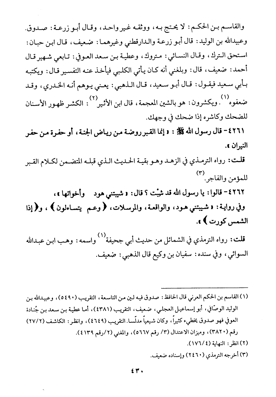 (¬1) القاسم بن الحكم العرني قال الحافظ: صدوق فيه لين من التاسعة، التقريب (5490)، وعبيد الله بن الوليد الوصّافي، أبو إسماعيل العجلي، ضعيف، التقريب (4381)، أما عطية بن سعد بن جُنادة العوفي فهو صدوق يخطيء كثيرًا، وكان شيعيًّا مدلّسًا. التقريب (4649)، وانظر: الكاشف (2/ 27) رقم (3820)، وميزان الاعتدال (3/ رقم 5667)، والمغني (2/ رقم 4139).