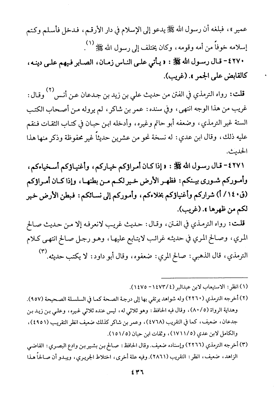 4270 - قال رسول الله - صلى الله عليه وسلم -: "يأتي على الناس زمان، الصابر فيهم على دينه، كالقابض على الجمر". (غريب).