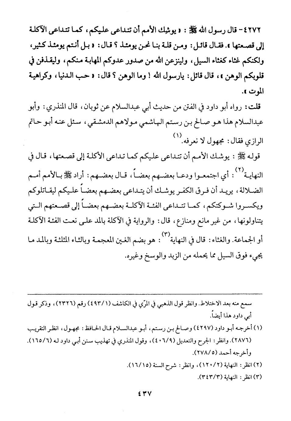 قلت: رواه أبو داود في الفتن من حديث أبي عبد السلام عن ثوبان، قال المنذري: وأبو عبد السلام هذا هو صالح بن رستم الهاشمي مولاهم الدمشقي، سئل عنه أبو حاتم الرازي فقال: مجهول لا نعرفه. (¬1)