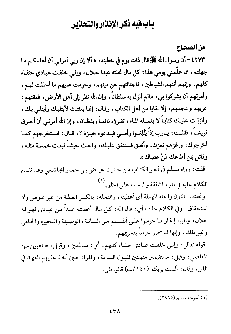 4273 - أن رسول الله - صلى الله عليه وسلم - قال ذات يوم في خطبته: "ألا إن ربي أمرني أن أعلمكم ما جهلتم، مما علّمني يومي هذا: كل مال نحلته عبدا حلال، وإني خلفت عبادي حنفاء كلهم، وإنهم أتتهم الشياطين، فاجتالتهم عن دينهم، وحرمت عليهم ما أحللت لهم، وأمرتهم أن يشركوا بي، ما لم أنزل به سلطانا، وإن الله نظر إلى أهل الأرض، فمقتهم: عربهم وعجمهم، إلا بقايا من أهل الكتاب، وقال: إنما بعثتك لأبتليك وأبتلي بك، وأنزلت عليك كتابًا لا يغسله الماء، تقرؤه نائمًا ويقظان، وإن الله أمرني أن أحرق قريشًا، فقلت: يا رب إذًا يَثْلِغوا رأسي فيدعوه خبزة؟، قال: استخرجهم كما أخرجوك، واغزهم نعزك، وأنفق فسننفق عليك، وابعث جيشًا نبعث خمسة مثله، وقاتل بمن أطاعك مَنْ عصاك".