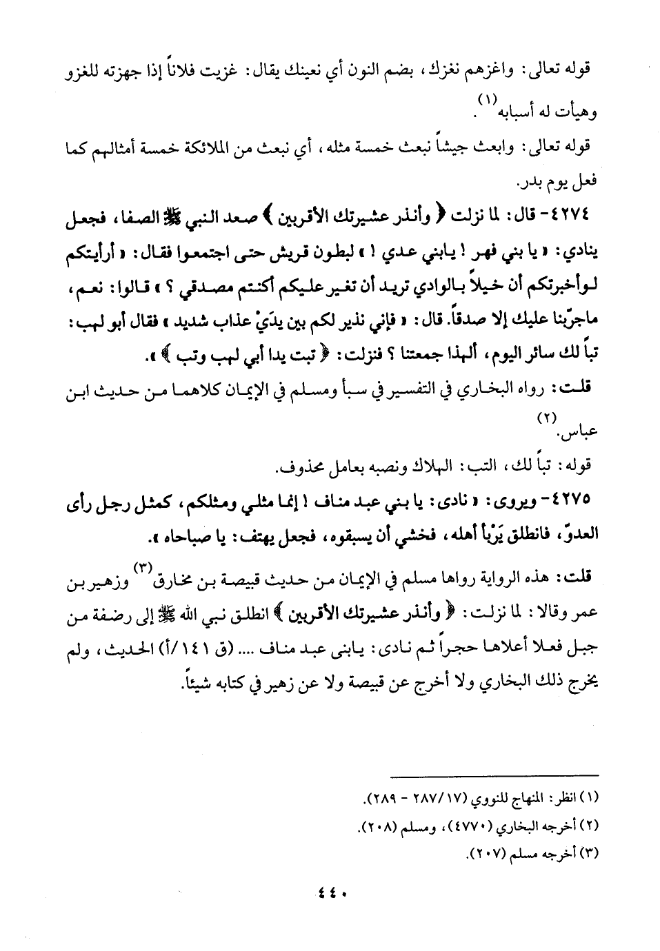4274 - قال: لما نزلت {وَأَنْذِرْ عَشِيرَتَكَ الْأَقْرَبِينَ} صعد النبي - صلى الله عليه وسلم - الصفا، فجعل ينادي: "يا بني فهر! يا بني عدي! " لبطون قريش حتى اجتمعوا فقال: "أرأيتكم لو أخبرتكم أن خيلًا بالوادي تريد أن تغير عليكم كنتم مصدقي؟ " قالوا: نعم، ما جرّبنا عليك إلا صدقًا. قال: "فإني نذير لكم بين يدَيْ عذاب شديد، فقال أبو لهب: تبًّا لك سائر اليوم، ألهذا جمعتنا؟ فنزلت: {تَبَّتْ يَدَا أَبِي لَهَبٍ وَتَبَّ} ".